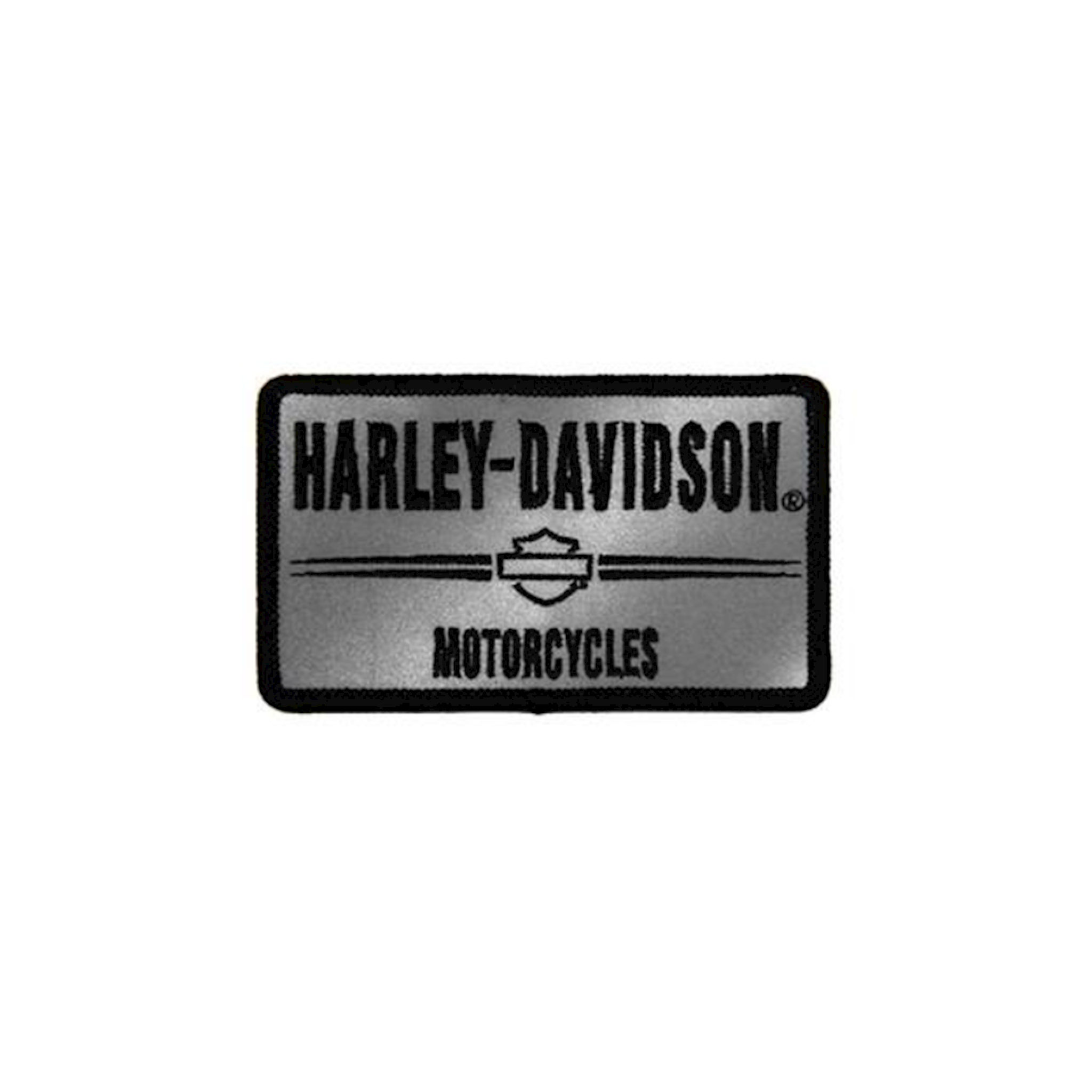 Harley-Davidson® 3" Reflective H-D Patch, 8011802. High-quality embroidered Harley-Davidson® script on a reflective background. Sturdy black woven trim that will hold up ride after ride. X-small size patch, Size: 3" x 2.25". Sew-on patch. Great looking patch to be sewn on your vest or jacket.