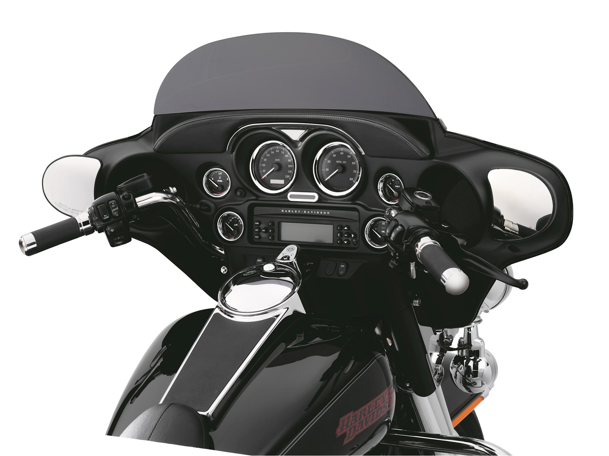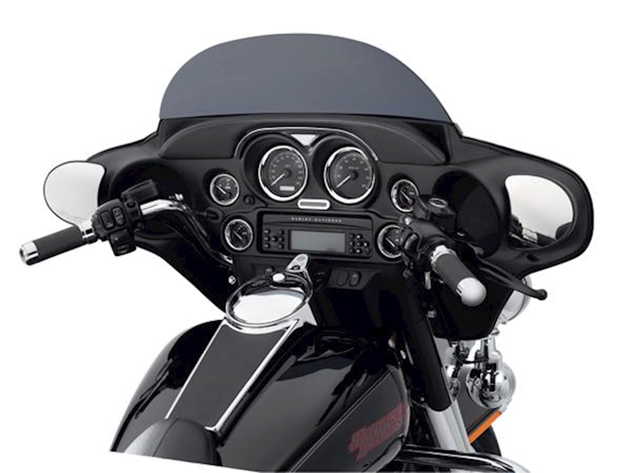 Original Equipment on the Screamin' Eagle® Electra Glide® Ultra model, this custom dash pad adds a recessed cockpit look to the inner fairing. The smooth top-stitched leather visor features a brilliant chrome-plated gauge eyebrow for a custom touch.