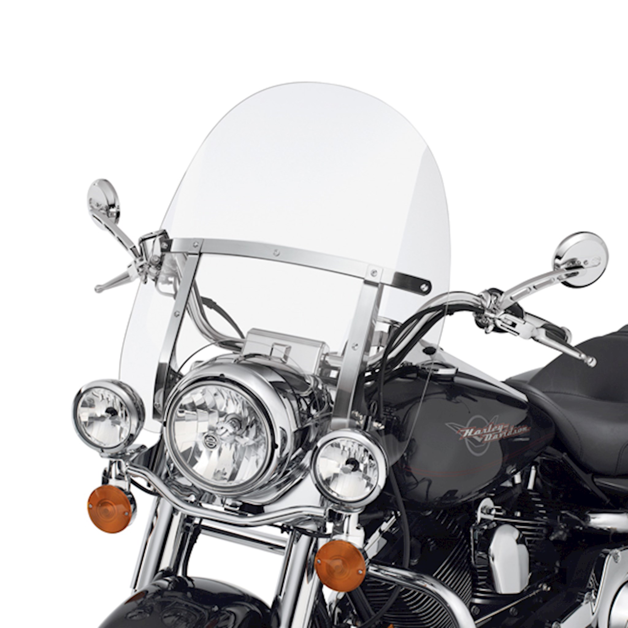 Designed to be installed or removed without tools in seconds, a detachable windshield gives you the freedom to define your ride at the drop of a hat. Ride across the country protected from the elements, then quickly remove the windshield to hit the streets in style. These one-piece windshields are formed from hard-coated polycarbonate material to resist scratching and the complete assembly features polished stainless brackets that mount to the Original Equipment rubber isolated docking points for ease of installation and removal. Windshields are available in a variety of heights to match your size and riding style. Fits '94-later Road King® models. Will fit '04-later FLHRS models with the additional purchase of Mounting Hardware Kit P/N 58221-04.