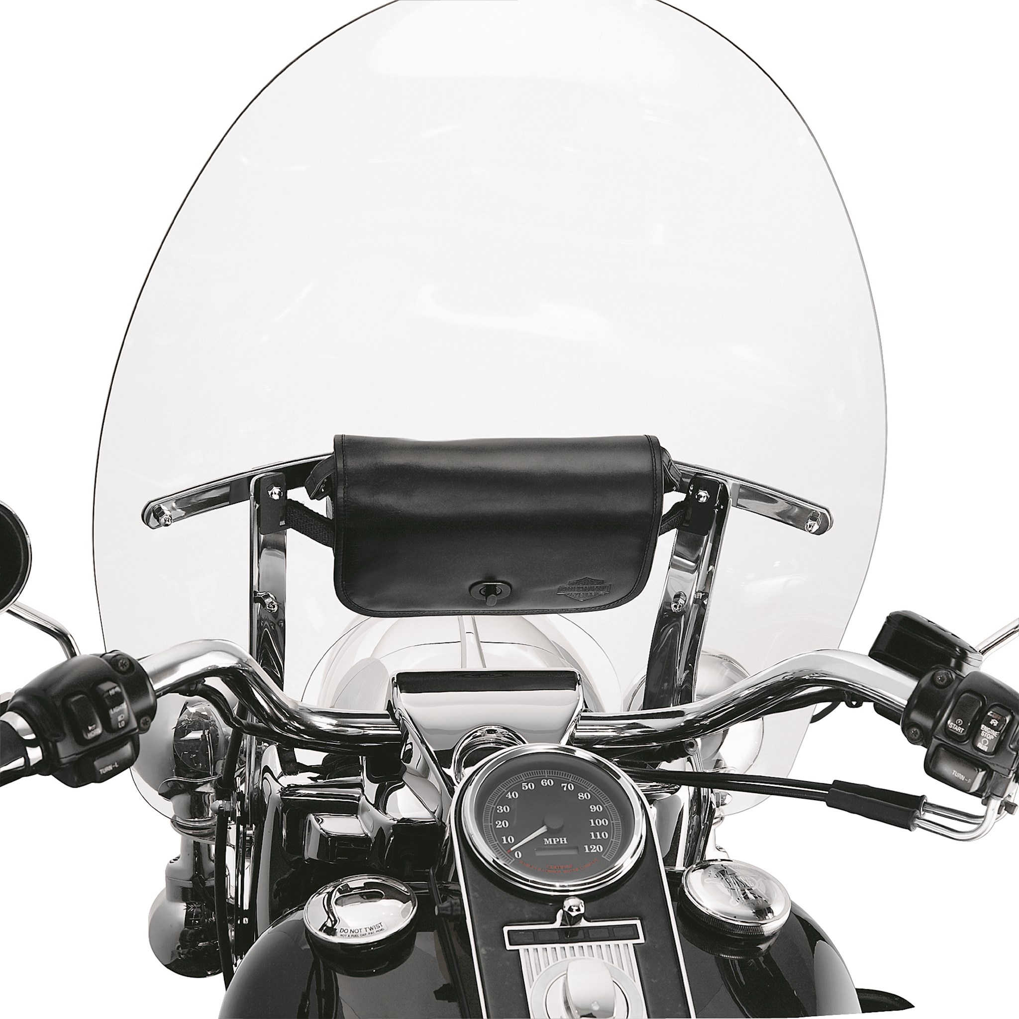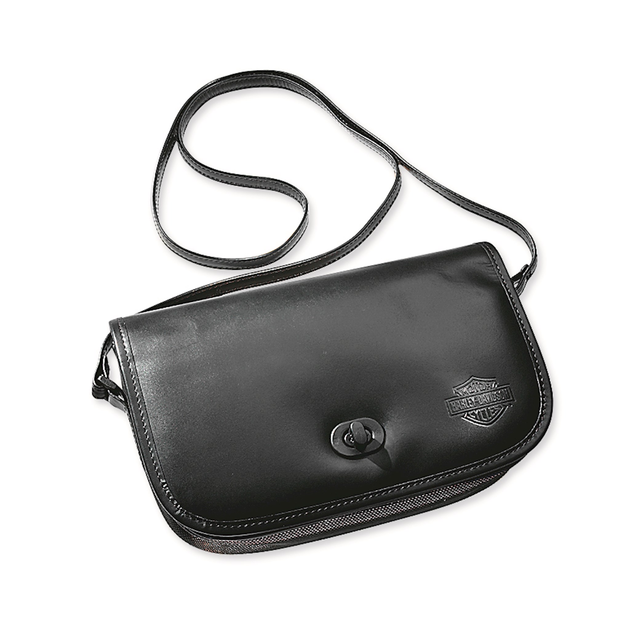 Combine the on-bike storage of a windshield bag with the take-along convenience of a handbag. Constructed of leather and nylon, this durable and spacious bag features a zippered inside pocket for cell phones, cameras, wallets or sunglasses. The convenient mounting system allows easy attachment to the windshield and the quick-detach buckle lets you take it with you when you leave your bike. The purse-length leather shoulder strap and the smooth leather flap with embossed Bar & Shield logo offer the styling flexibility to complement any Harley-Davidson® motorcycle or MotorClothes® fashion design. Maximum capacity 2.5 lbs.
