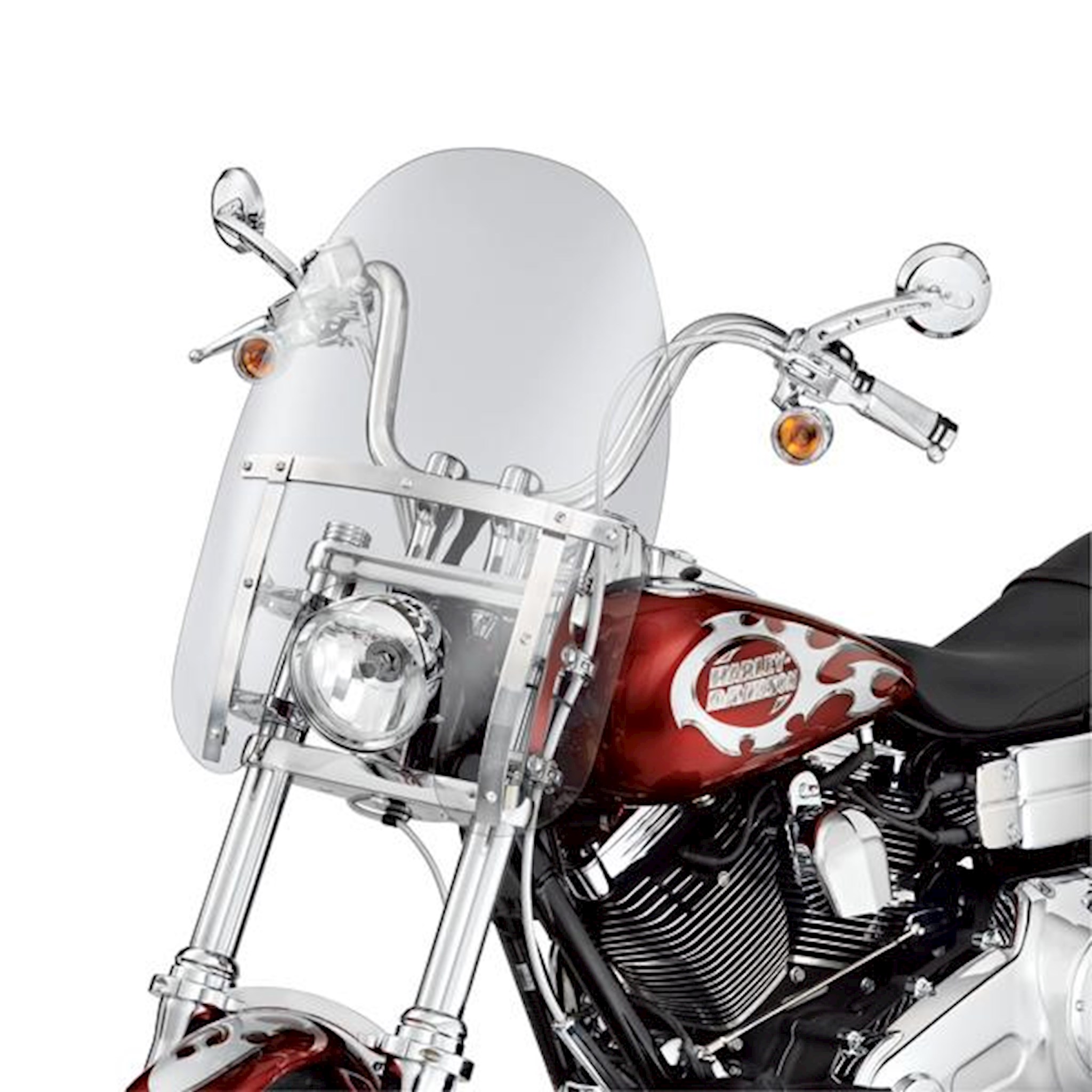 Combine the classic Harley-Davidson® windshield shape with a revolutionary new attachment system and you have the best of style and function. The windshield mounts to the fork tubes with elegant die-cast lever-release clamps, so the windshield does not require any "leave-behind" docking hardware. You get quick on-and-off convenience and a clean, custom look. No tools are required and the kit includes everything needed to install the windshield. The tough, hard-coated polycarbonate windshield is available in your choice of traditional polished or gloss black horizontal and vertical braces. Fits '06-later FXDWG and '13-later FXSB and FXSBSE models.