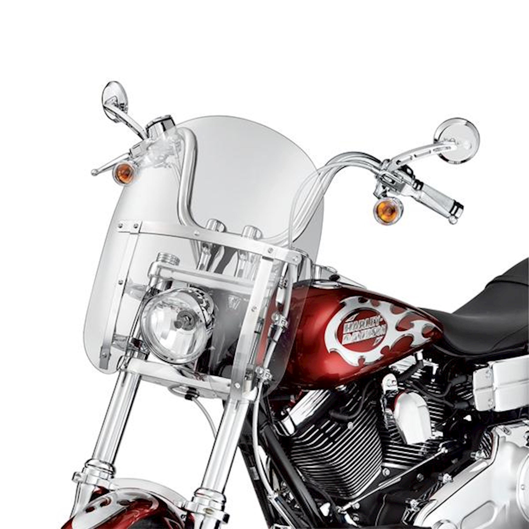 Combine the classic Harley-Davidson® windshield shape with a revolutionary new attachment system and you have the best of style and function. The windshield mounts to the fork tubes with elegant die-cast lever-release clamps, so the windshield does not require any "leave-behind" docking hardware. You get quick on-and-off convenience and a clean, custom look. No tools are required and the kit includes everything needed to install the windshield. The tough, hard-coated polycarbonate windshield is available in your choice of traditional polished or gloss black horizontal and vertical braces. Fits '06-later FXDWG and '13-later FXSB and FXSBSE models.