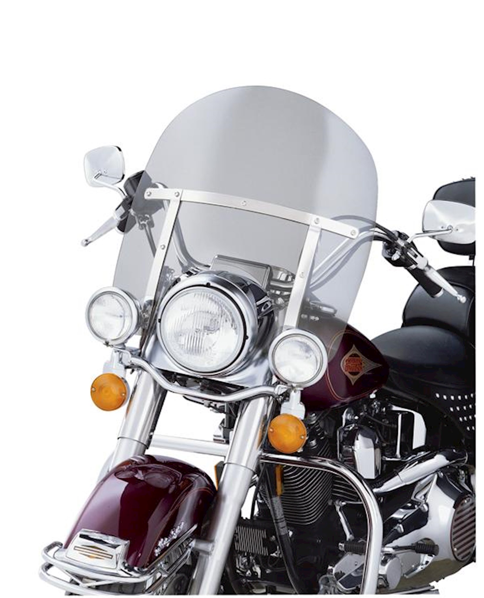 This one-piece polycarbonate windshield is designed with a larger diameter opening to wrap around the contour of the Freight Train Headlamp Nacelle Kit. Windshield is shaped to accept Original Equipment or accessory Auxiliary Lamp Kits. Fits '86-later FLS, FLSTC, FLSTF, FLSTFB, '06 FLST and '93-'96 FLSTN models equipped with the Chrome Headlamp Nacelle Kit P/N 67907-96B. Fits with auxiliary lamps.