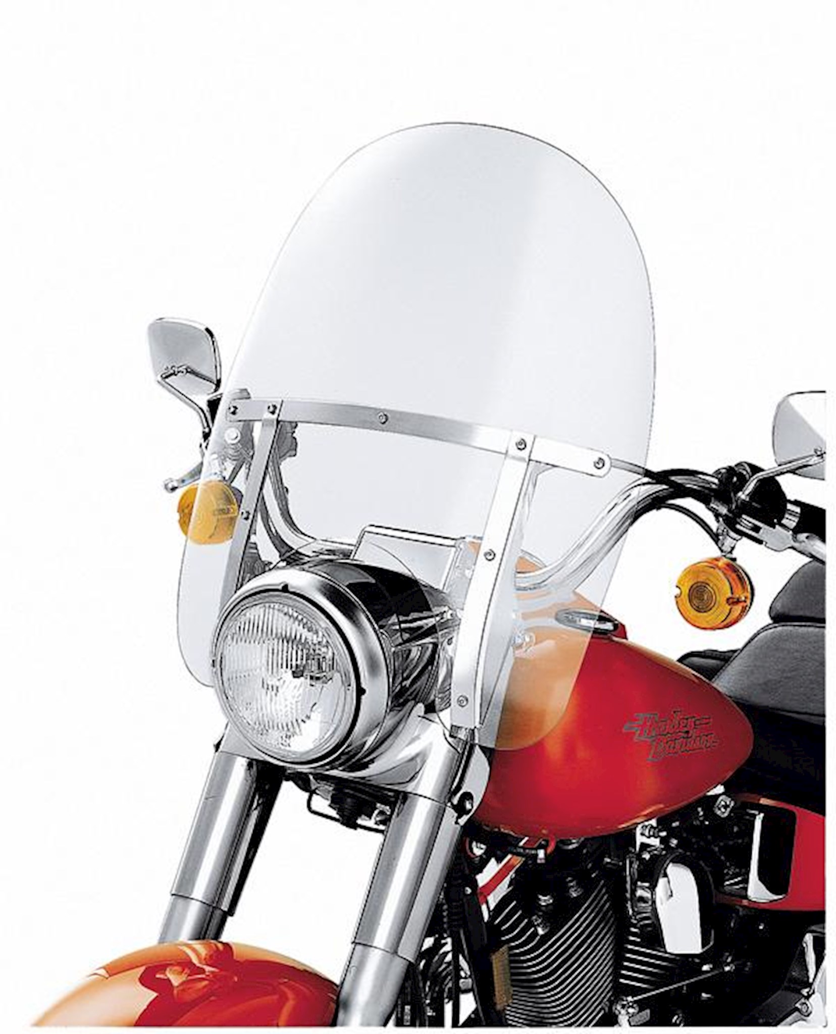 This one-piece polycarbonate windshield is designed with a larger diameter opening to wrap around the contour of the Freight Train Headlamp Nacelle Kit. Full length windshield will not fit with Original Equipment or accessory Auxiliary Lamp Kits. Fits '86-later FLS, FLSTC, FLSTF, FLSTFB, '06 FLST and '93-'96 FLSTN models equipped with the Chrome Headlamp Nacelle Kit P/N 67907-96B. Fits without auxiliary lamps.