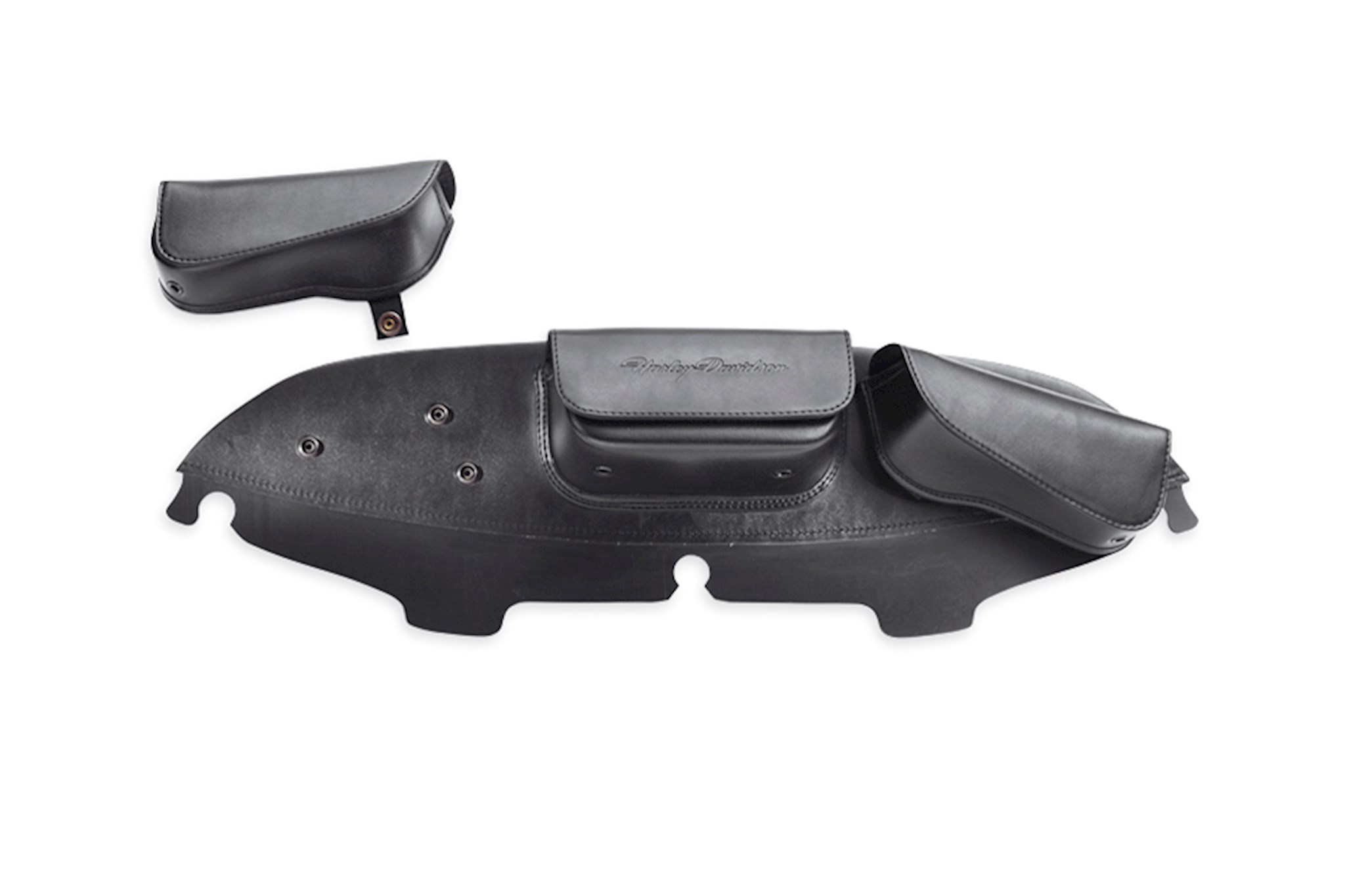 Convenient storage space at your fingertips. Designed to complement H-D wind deflectors and windshields, this fairing pouch is ideal for storing cell phones, sunglasses and other small items. The sturdy plastic pouches are wrapped in supple UV-resistant vinyl for a premium look and feel and the magnetic closures keep your items within reach, while not detracting from the tastefully smooth styling. The left-hand pouch can be easily removed to accommodate your fairing-mounted GPS unit. Attractive Harley-Davidson script is featured on the front center pouch and on the outboard - facing side, visible through the windshield.