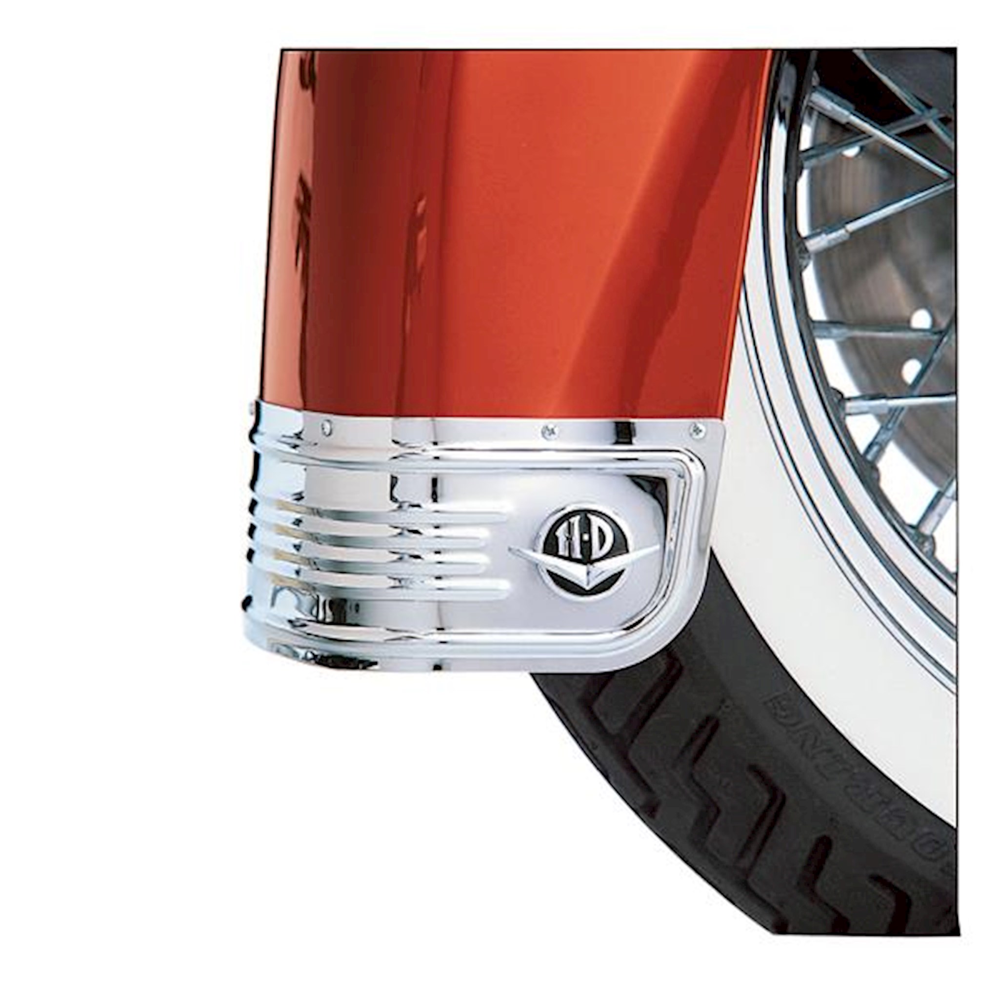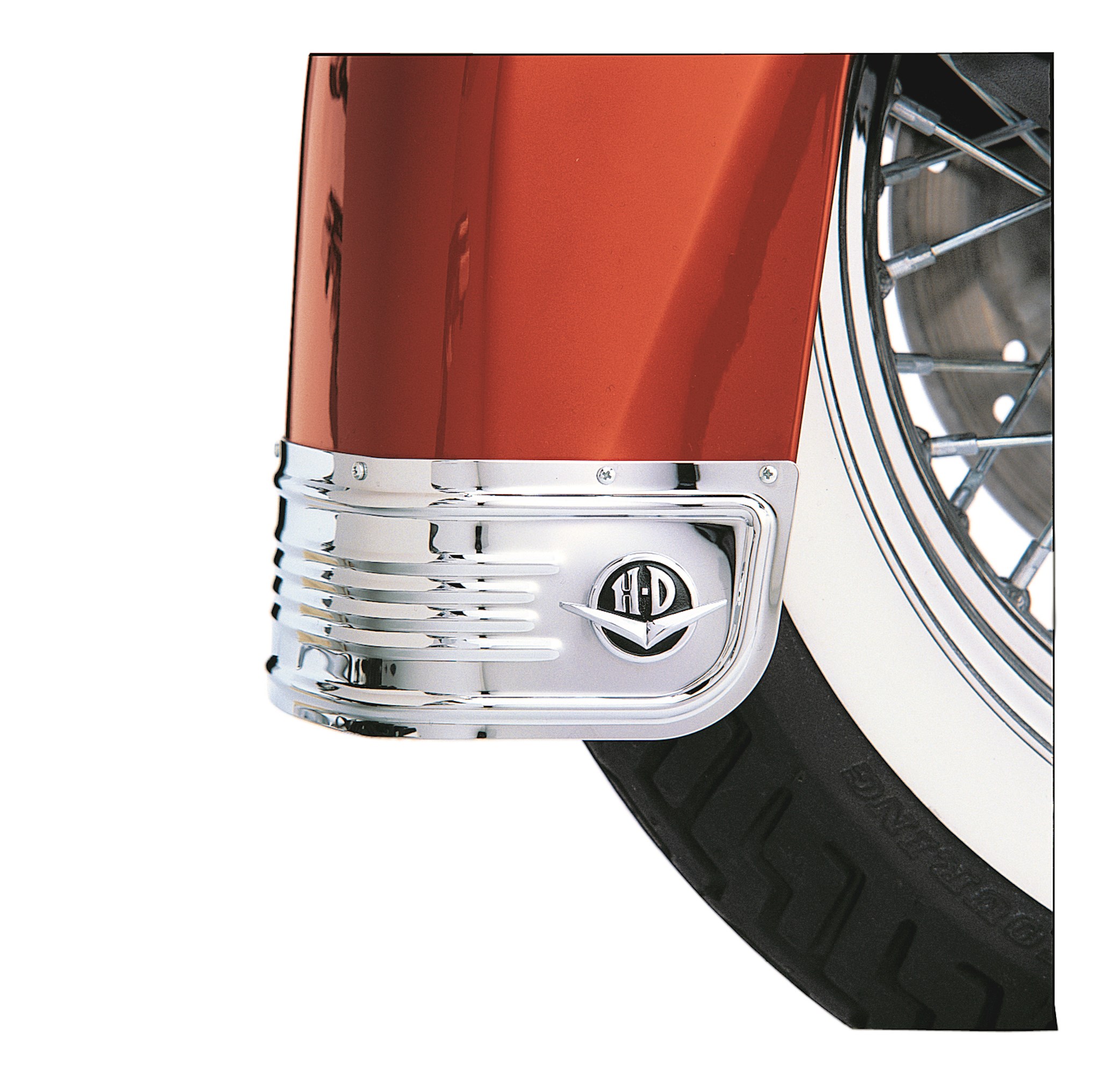 The latest in the family of Road King-inspired accessories, this chrome-plated steel fender skirt features four raised accent ribs and a die-cast Road King® Classic medallion in chrome with black accents. Mounting hardware included.