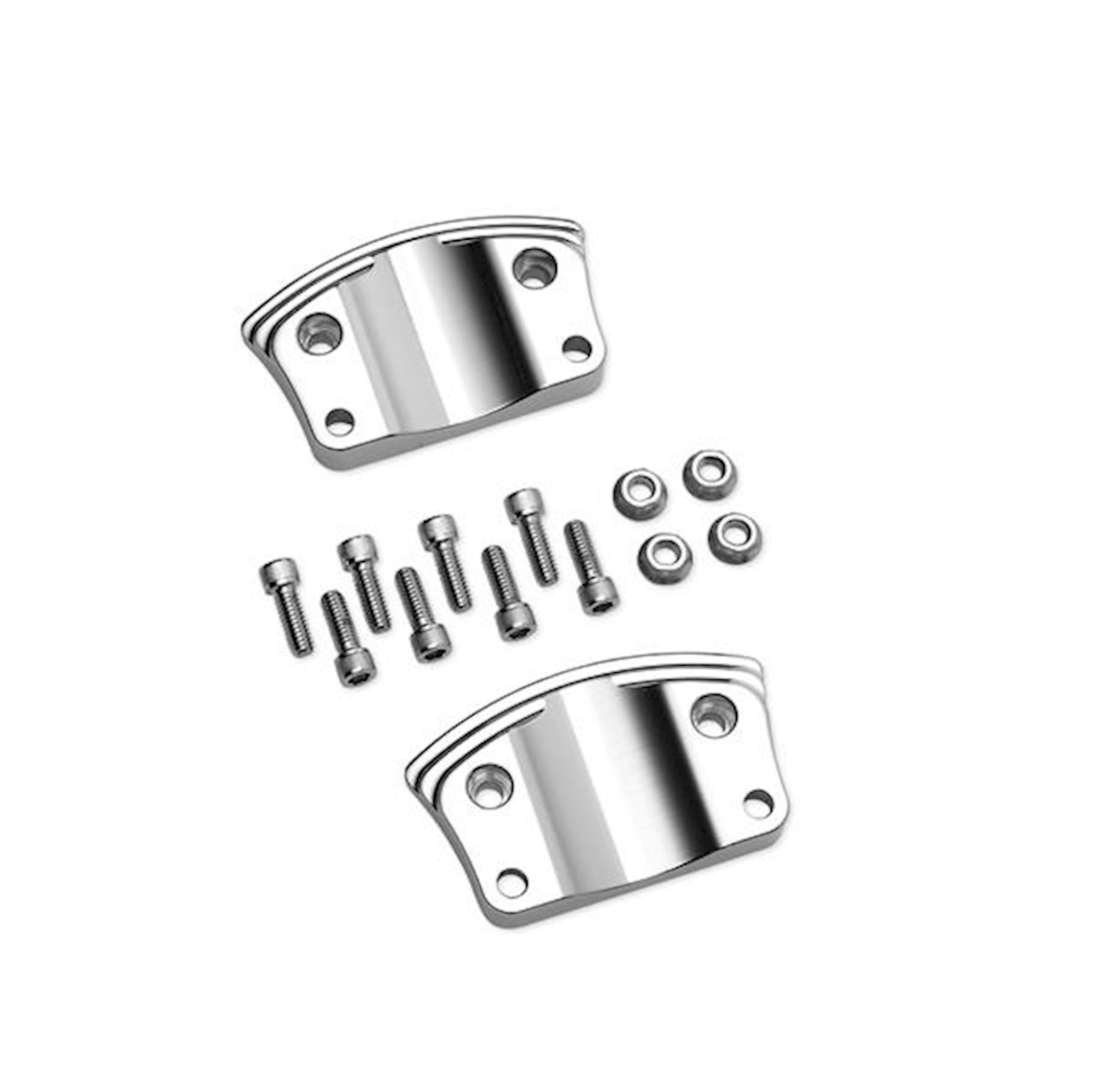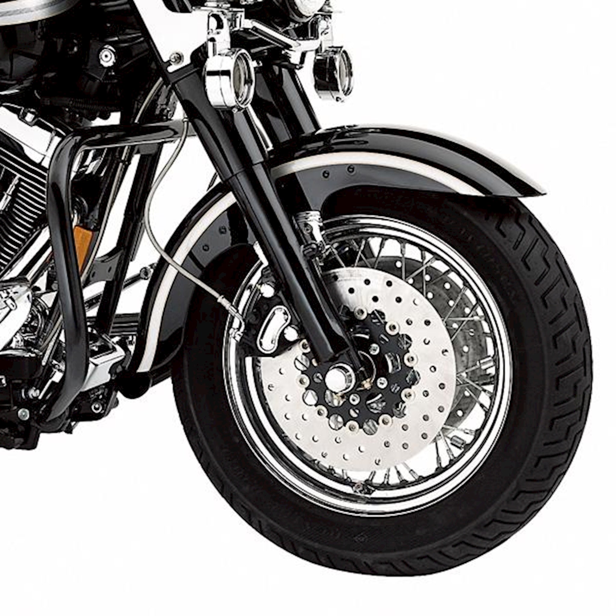 Add a true custom style to your Touring model. This polished and chrome-plated Adapter Kit will allow you to install the smooth curving Fat Boy® or Street Stalker® front fender on your Touring bike. Manufactured from 6061-T6 billet aluminum, this kit includes all necessary mounting hardware. See your Dealer for primed or Color-Matched fender options.