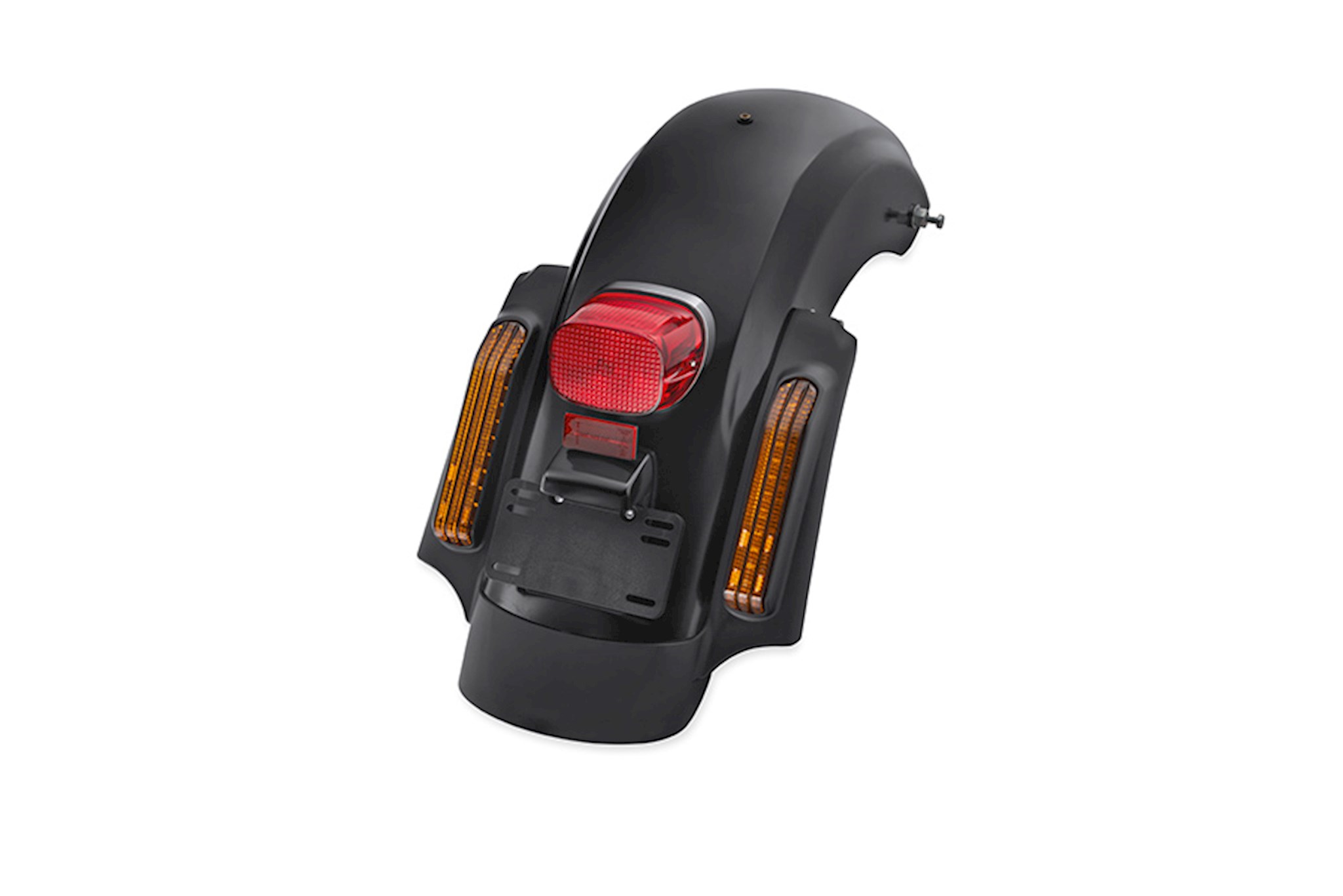 Complete with integrated LED brake lights, turn indicators and tail lights, this custom rear fascia and fender kit keeps the back of your bike clean, classy and simple. Originally featured on CVO™ Touring models, this kit includes everything you need to smoothly blend the shape of the rear fender into the saddlebags and hide the saddlebag mounting structure. Fits '14-later Touring (except FLHRC and CVO models). Does not fit models equipped with Saddlebag Guard Rails P/N 90200561.