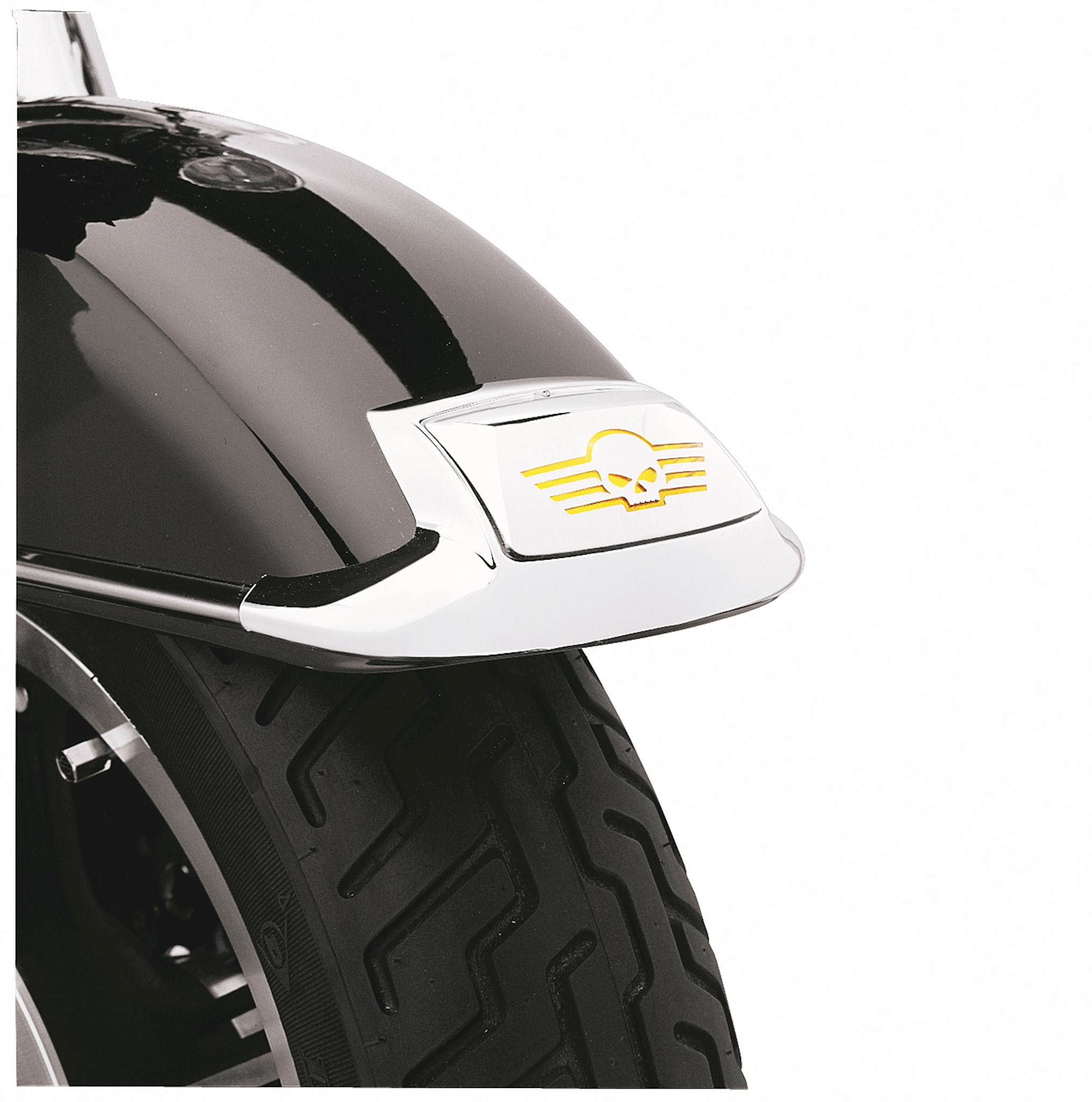 This chrome-plated fender tip lens kit adds a little attitude to your ride. The kit features front and rear lenses with a translucent illuminated skull silhouette. The easy-to-install kit includes an amber front lens and red rear lens.