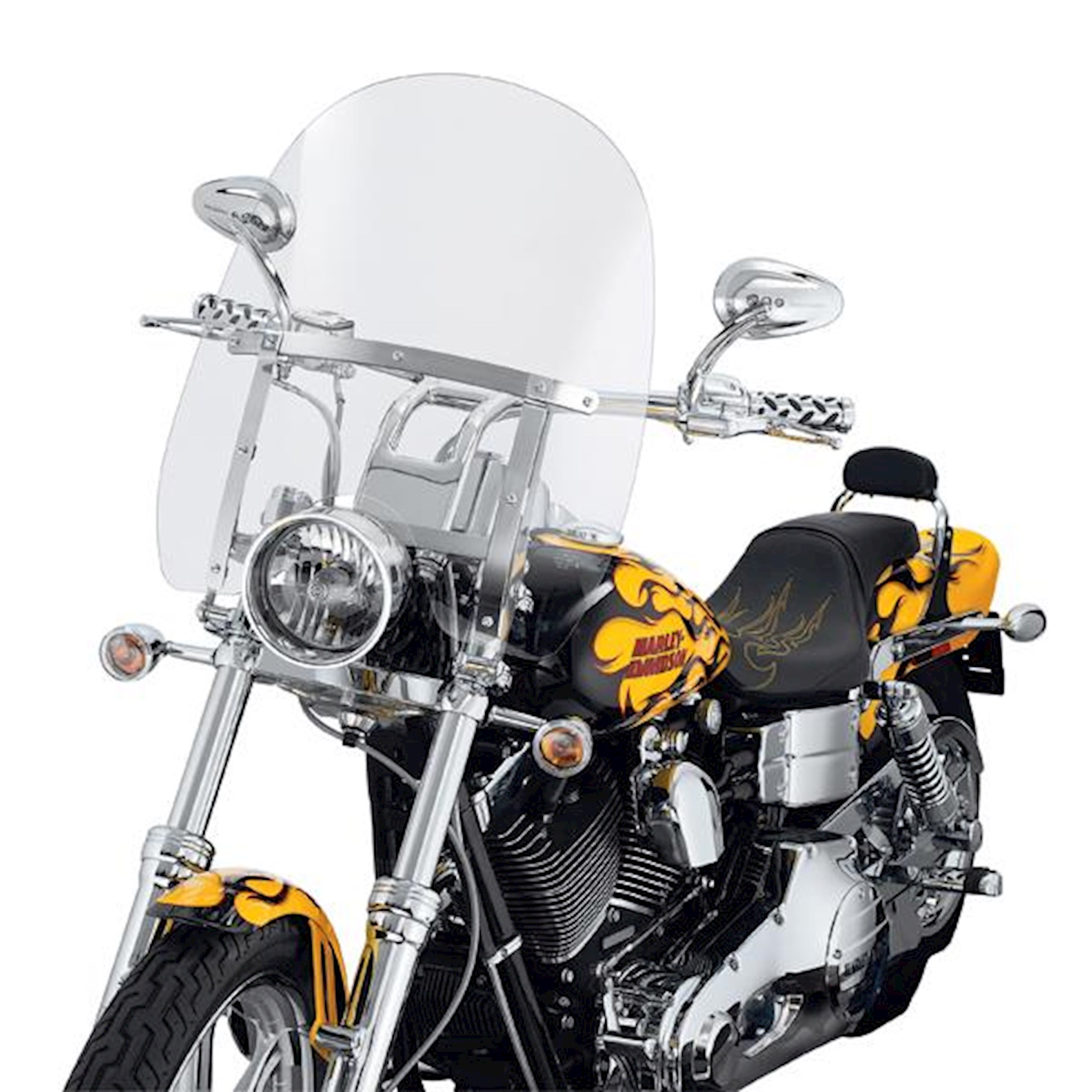 Combine the classic Harley-Davidson® windshield shape with a revolutionary new attachment system and you have the best of style and function. The windshield mounts to the fork tubes with elegant die-cast lever-release clamps, so the windshield does not require any "leave-behind" docking hardware. You get quick on-and-off convenience and a clean, custom look. No tools are required and the kit includes everything needed to install the windshield. The tough, hard-coated polycarbonate windshield is available in your choice of traditional polished or gloss black horizontal and vertical braces. Fits '93-'05 FXDWG and '86-later FXST, FXSTC and FXSTB models.