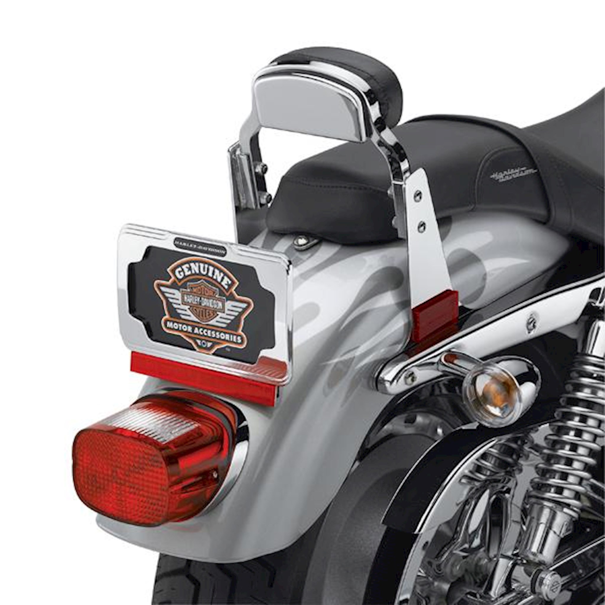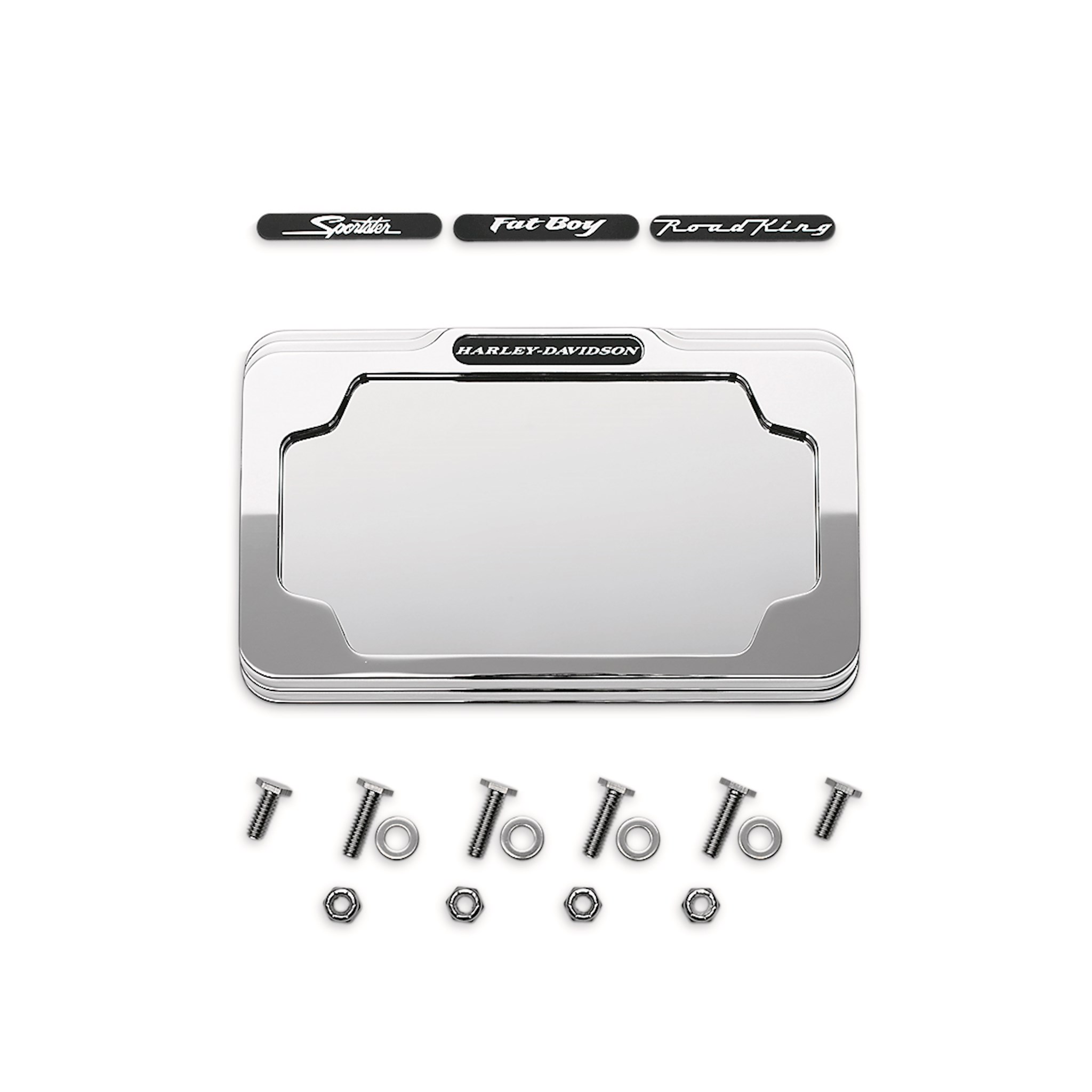 Make a custom statement. Manufactured from billet aluminum, this mirror-polished license plate frame features hidden hardware and bright chrome backing plate for a clean look. The kit includes "Harley-Davidson", "Sportster", "Fat Boy" and "Road King" logo engraved inserts for the ultimate finishing touch. Chrome-plated stainless steel mounting hardware included.