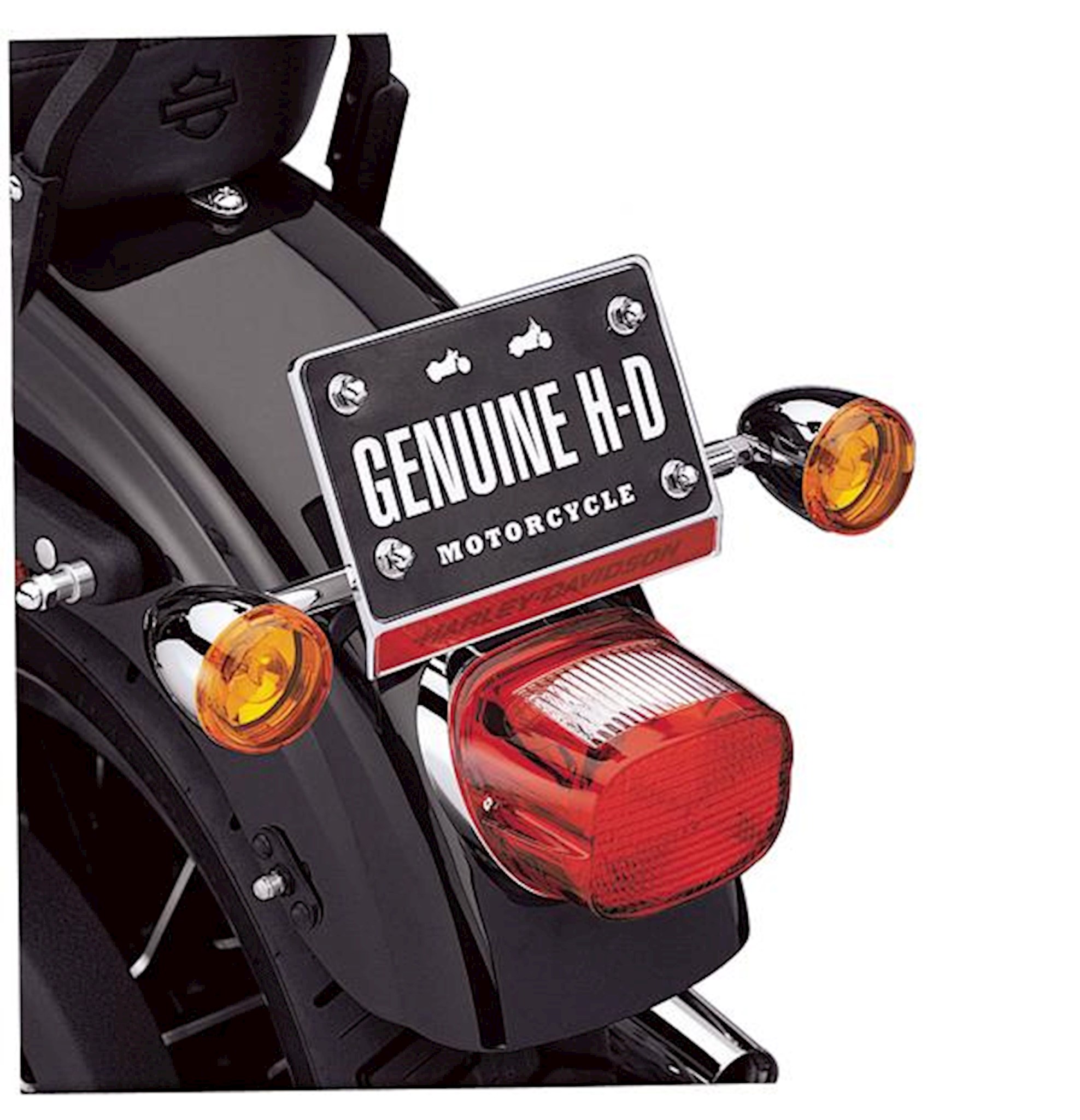 This kit combines our popular Layback License Plate Mount with an integrated turn signal bar to add a stylish slant to the rear fender. Kit relocates the Original Equipment bullet-style turn signals from the fender strut to the turn signal bar to allow clearance for saddlebags. This kit is a stylish alternative to Turn Signal Relocation Kit P/N 68732-02A and includes all necessary mounting hardware.