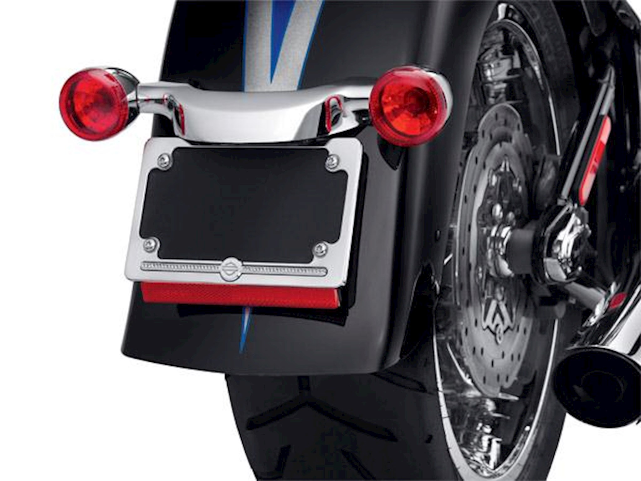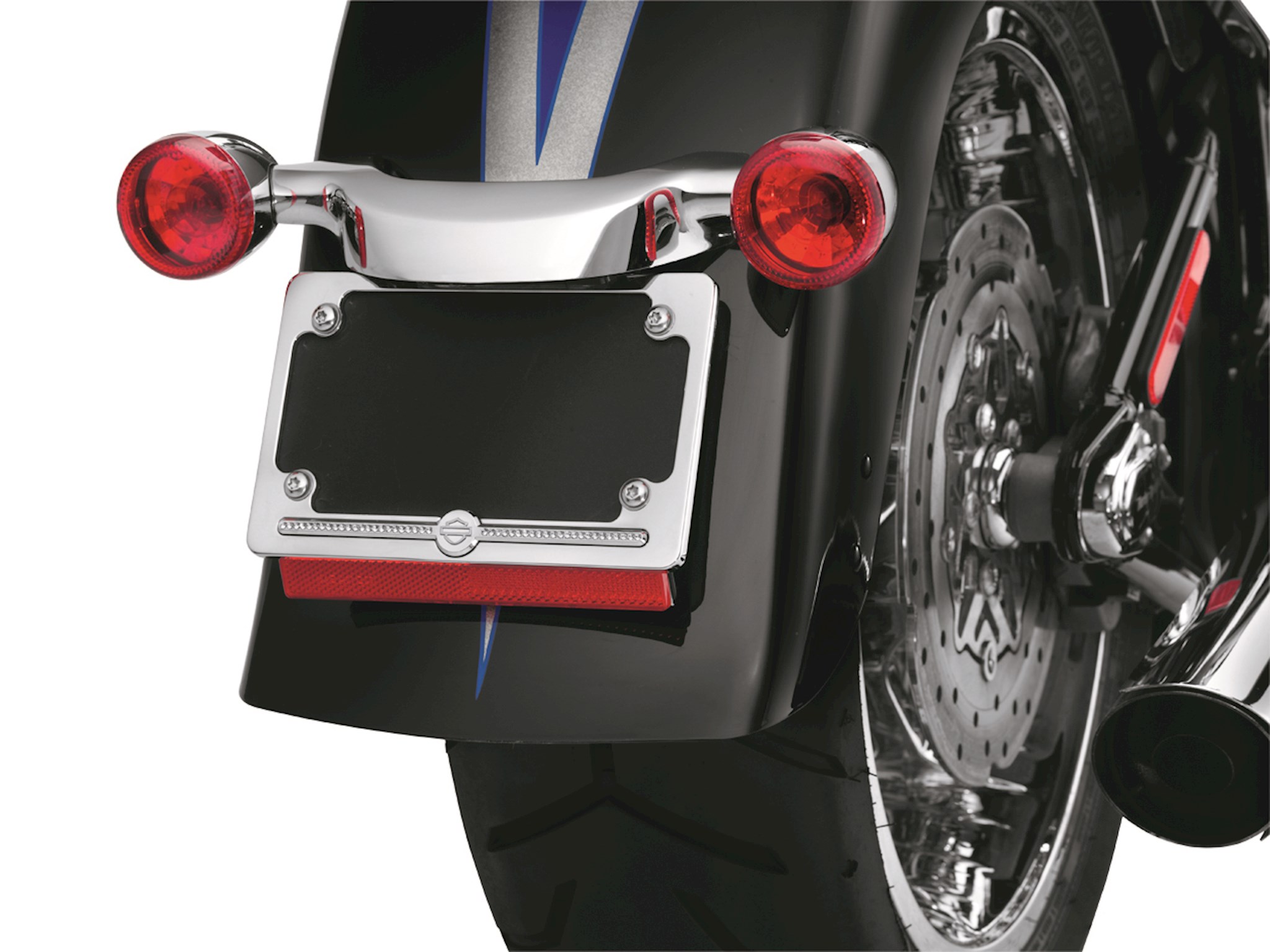 Radius-cornered License Plate Frame features a single row of rhinestones emanating from a central raised Bar & Shield logo. Frame is available with top- or bottom-mounted medallion to maximize visibility in specific applications. Fits 7.25" x 4.25" license plates (except XR, FLHTCUTG and models equipped with Layback License Plate Mounting Kits or side-mount license plates).