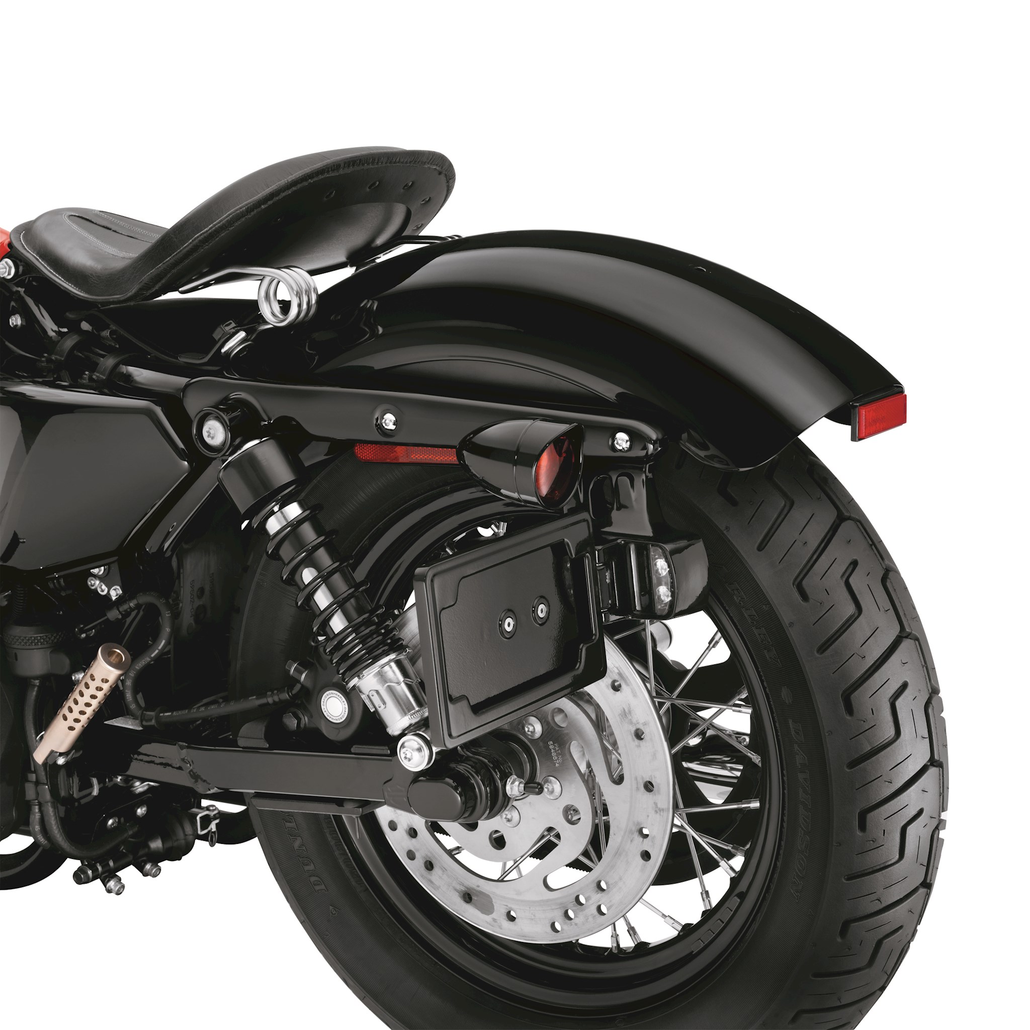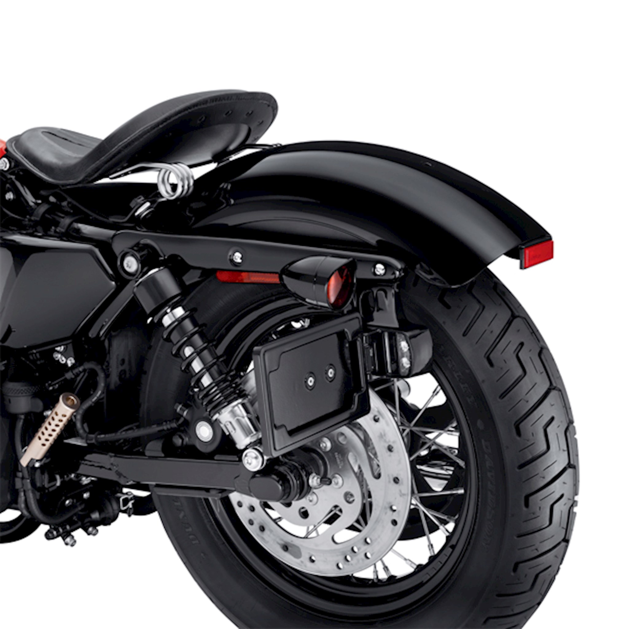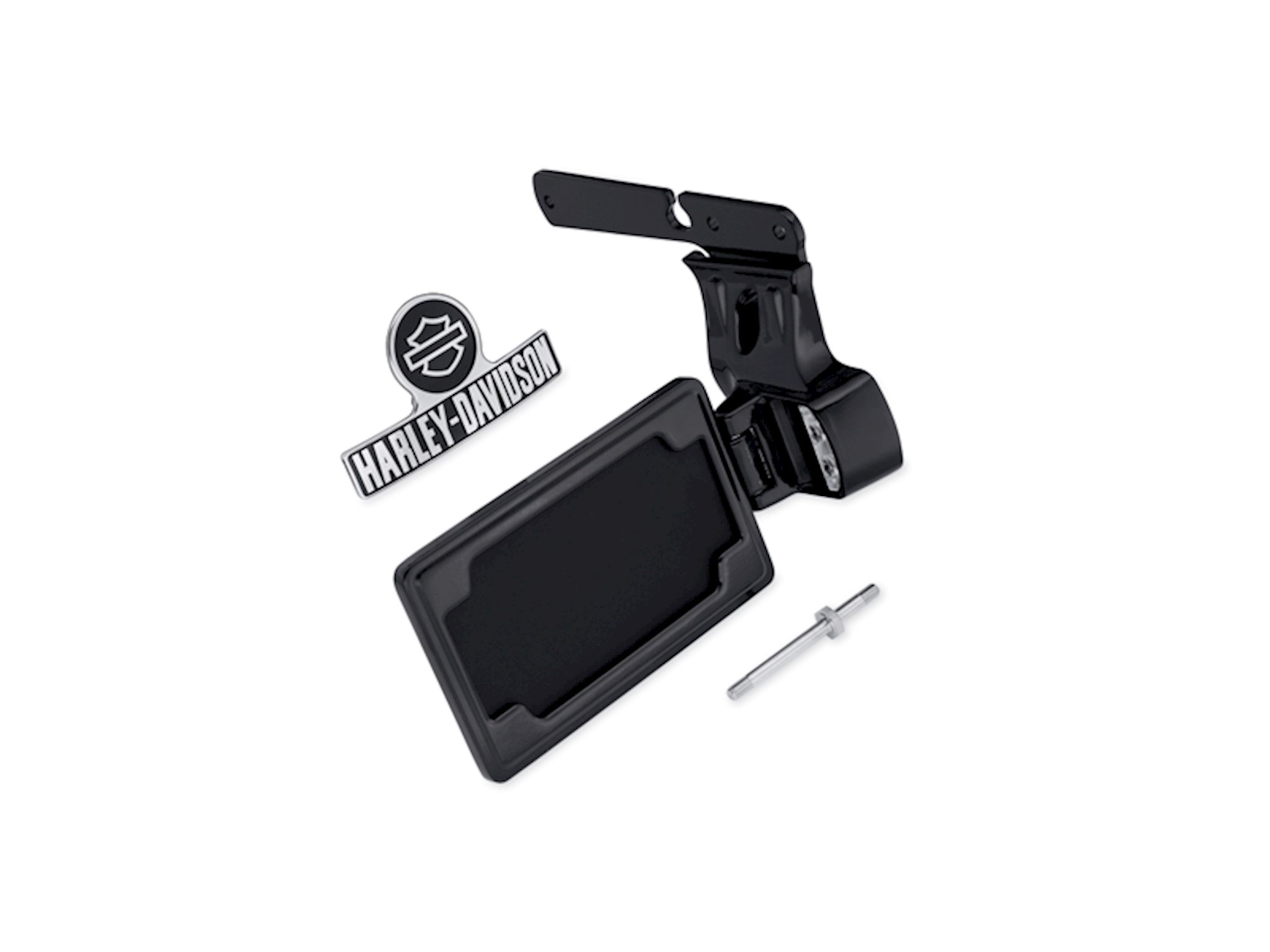 Add a clean, custom look to the rear fender. This stylish kit moves the license plate from the fender to a side-mount location, visually lowering the bike's profile and opening up the view of the rear end. This strut-mounted hinged frame conceals the license mounting hardware and features a smooth back that hides the unfinished side of the plate. Kit includes LED license plate illumination and a curved Bar & Shield medallion, shaped to conceal the original license mounting holes in the fender. Purchase of tail lamp without license illumination window is recommended for models with center-mounted tail lights. Fits '04-later XL models (except XL1200T). Will not fit some International Specification '14-later XL883N (Iron 883) models with Original Equipment LED Turn Signals. See your dealer for details. Will not fit models equipped with rigid mount saddlebags, rigid mount sissy bars and Turn Signal Relocation Kit P/N 68732-02A and 68733-02A