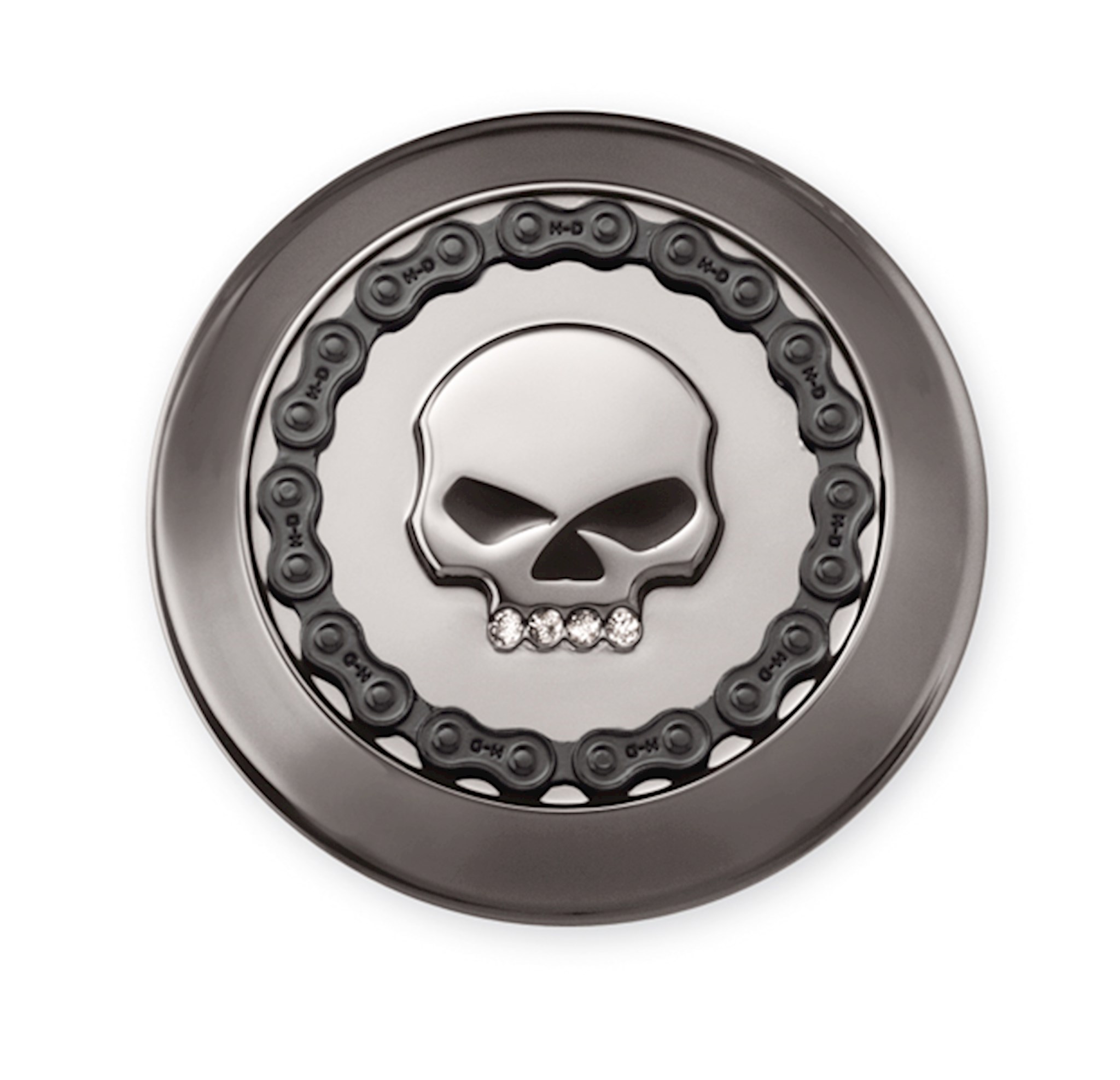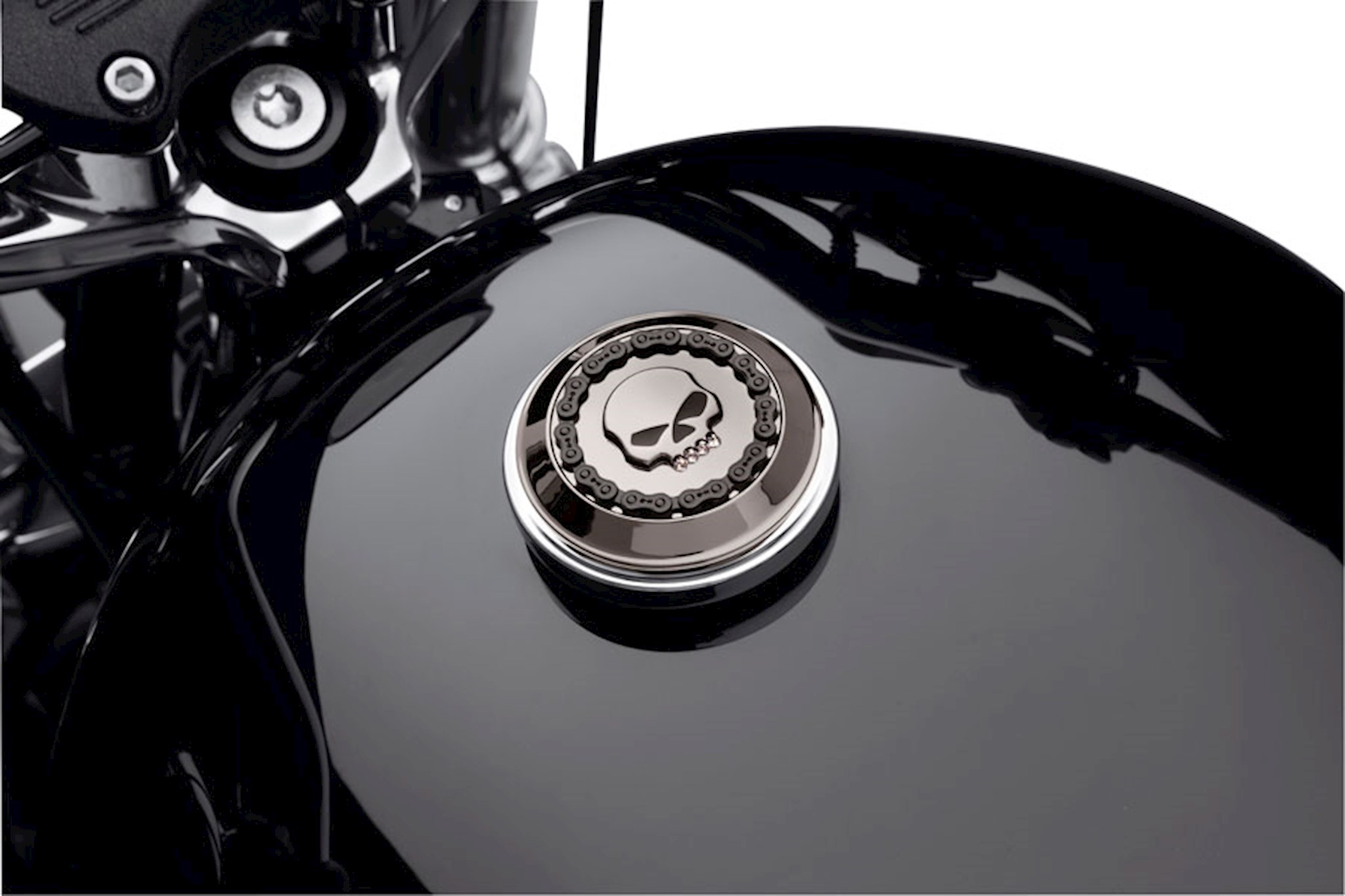 The sinister smokey chrome finish is the ideal complement to a blacked-out ride and the contrasting 3-D chain rims the surface and surrounds the distinctive Willie G Skull with black-filled eyes. Select from the traditional skull design or for a little added zing, choose the version with the edgy jewel-encrusted jaw line. Either way, this complete collection is a tribute to the mechanical side of your ride. Fits '83-later models (except VRSC, XG, XL883N, XL1200V, '04-'10 XL1200L and XL1200C, '08-later XR, '14-later XL, all FXD and FXDX models, '05-'06 FXDC, all FXR with plastic fuel cap, FXS, FXSB, FXSBSE, FLSTNSE, FXST-Aus, Electra Glide, Road Glide, Tour Glide, Trike and all fuel caps with gauges).