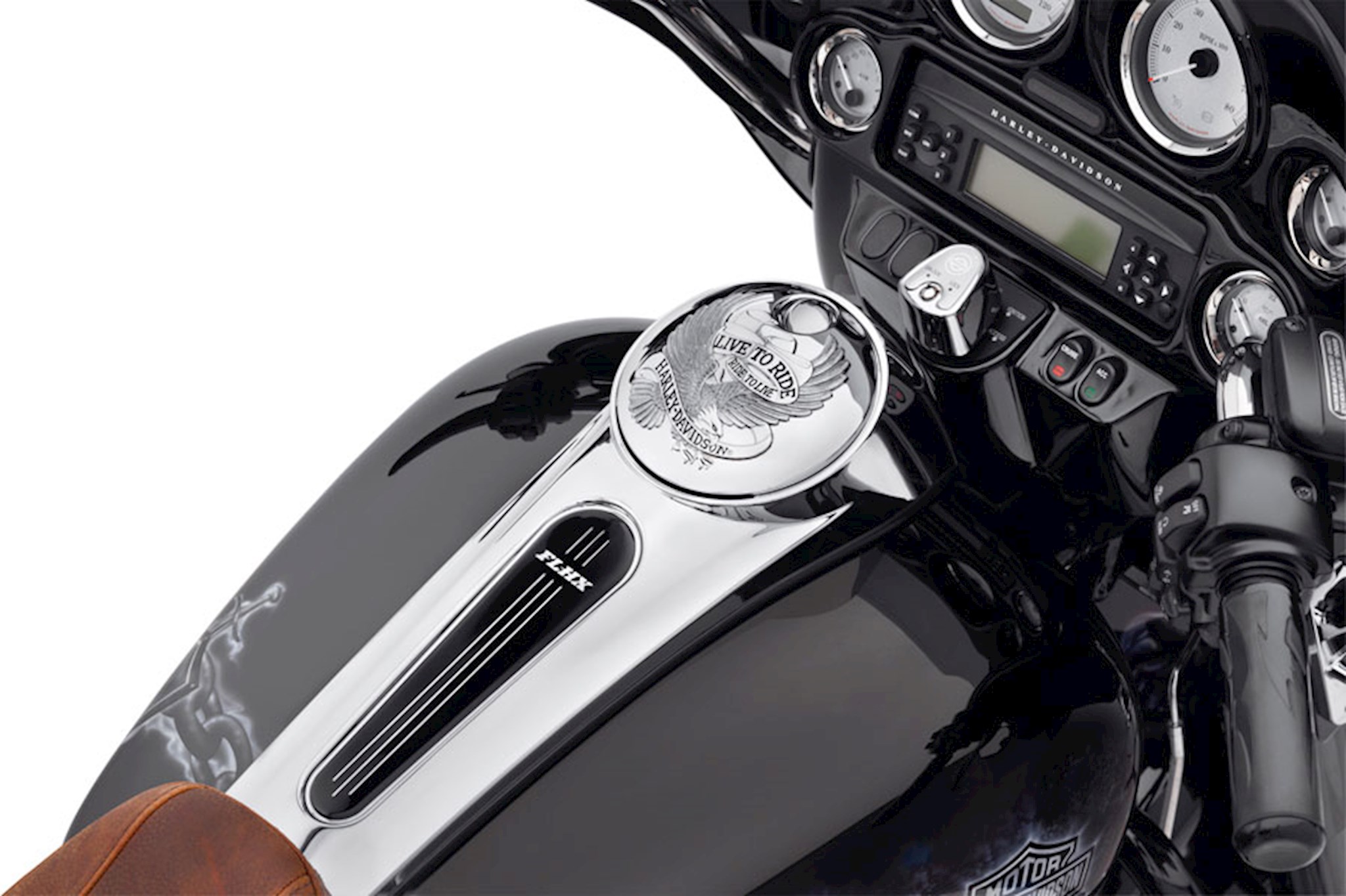 "Live To Ride, Ride to Live." It has become the motto of the Harley-Davidson nation, accompanying riders over millions of miles of travel. This collection is a tribute to that way of life. These easy-to-install Fuel Doors replace the stock door, and reuse Original Equipment mounting hardware and lock. Available in your choice of gold or chrome finish. Fits '08-later Electra Glide®, Street Glide®, Ultra Limited, Road Glide® and Trike models with center fill tank.