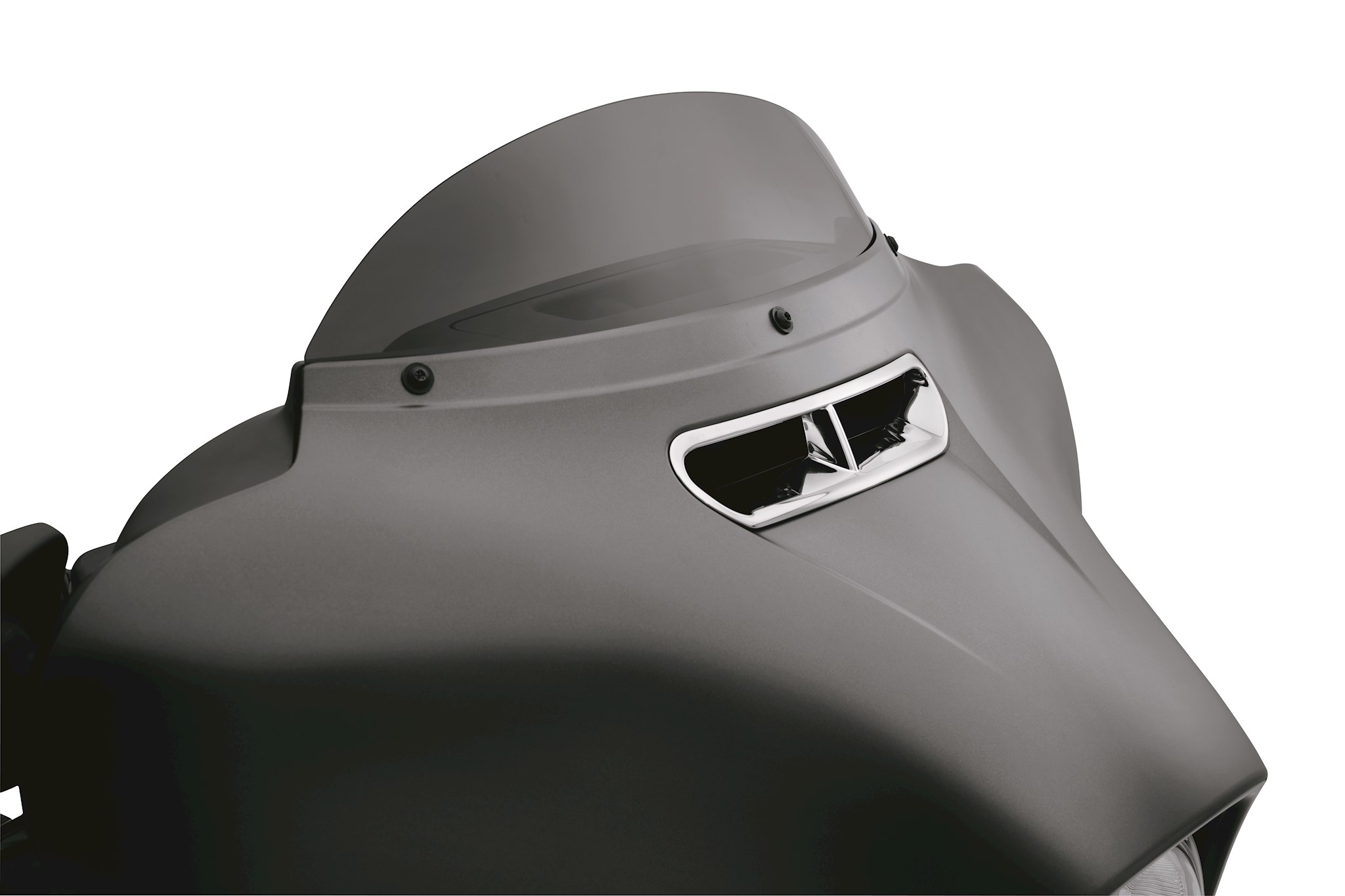 The batwing fairing is a key visual and functional element of your Touring bike, and the Splitstream vent sits front and center for all to see. Shaped to replace the Original Equipment satin black soft trim, this one-piece rigid component blends into the sweep of the outer fairing and dresses the vent in style. Available in your choice of chrome or gloss black finishes, this vent trim is the perfect complement to available windshield trim kits. Fits '14-later Electra Glide®, Street Glide®, Ultra Limited and Tri Glide® models with batwing fairing.