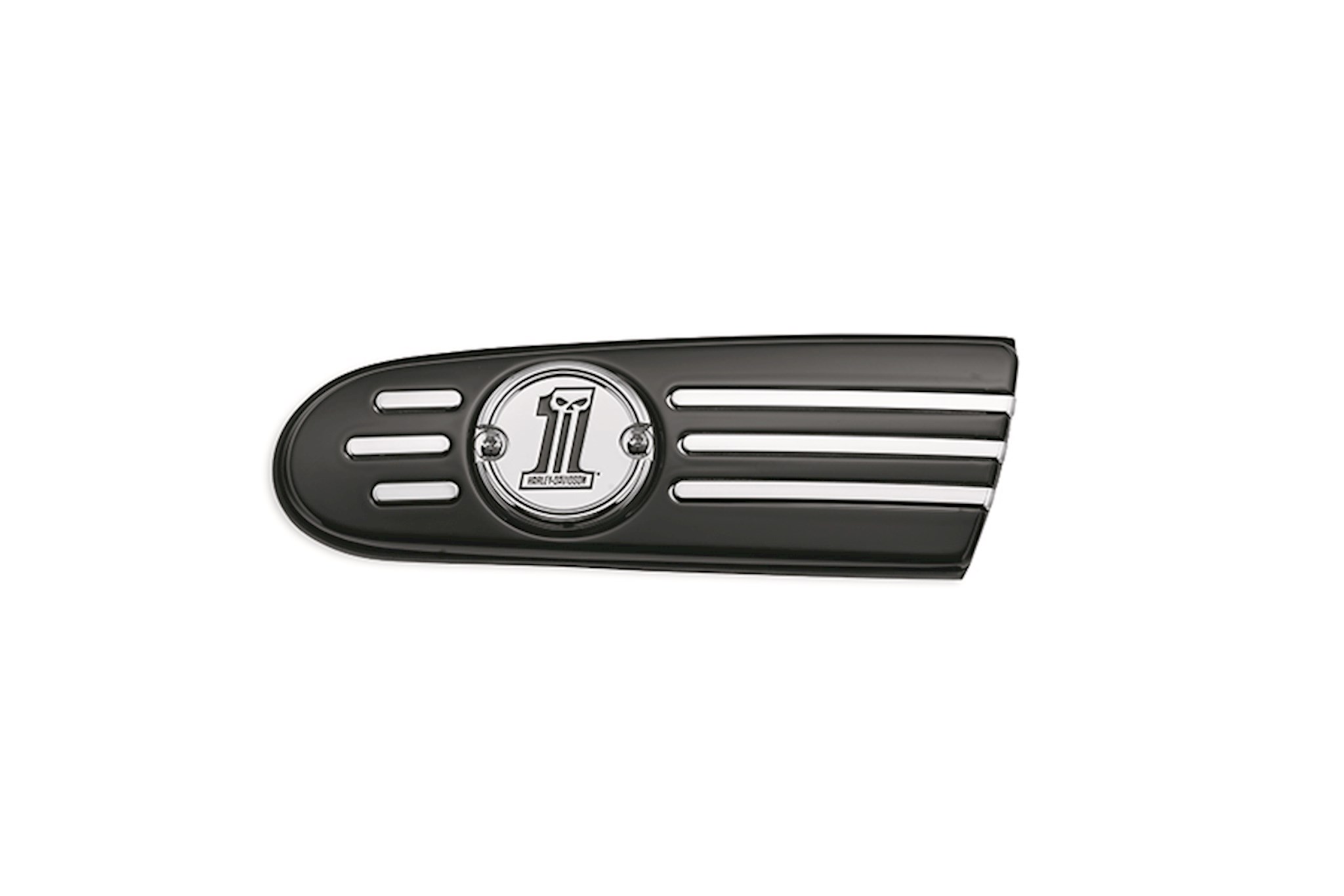 The sinister Harley-Davidson #1 Skull logo dresses for a night on the town. This complete die-cast aluminum collection has been polished and chrome-plated to a brilliant shine, and then finished with a contrasting black-filled Dark Custom™ Skull logo. The black-filled race track stripe and recessed hardware pockets provide added depth and dimension. Includes chrome-plated mounting hardware.