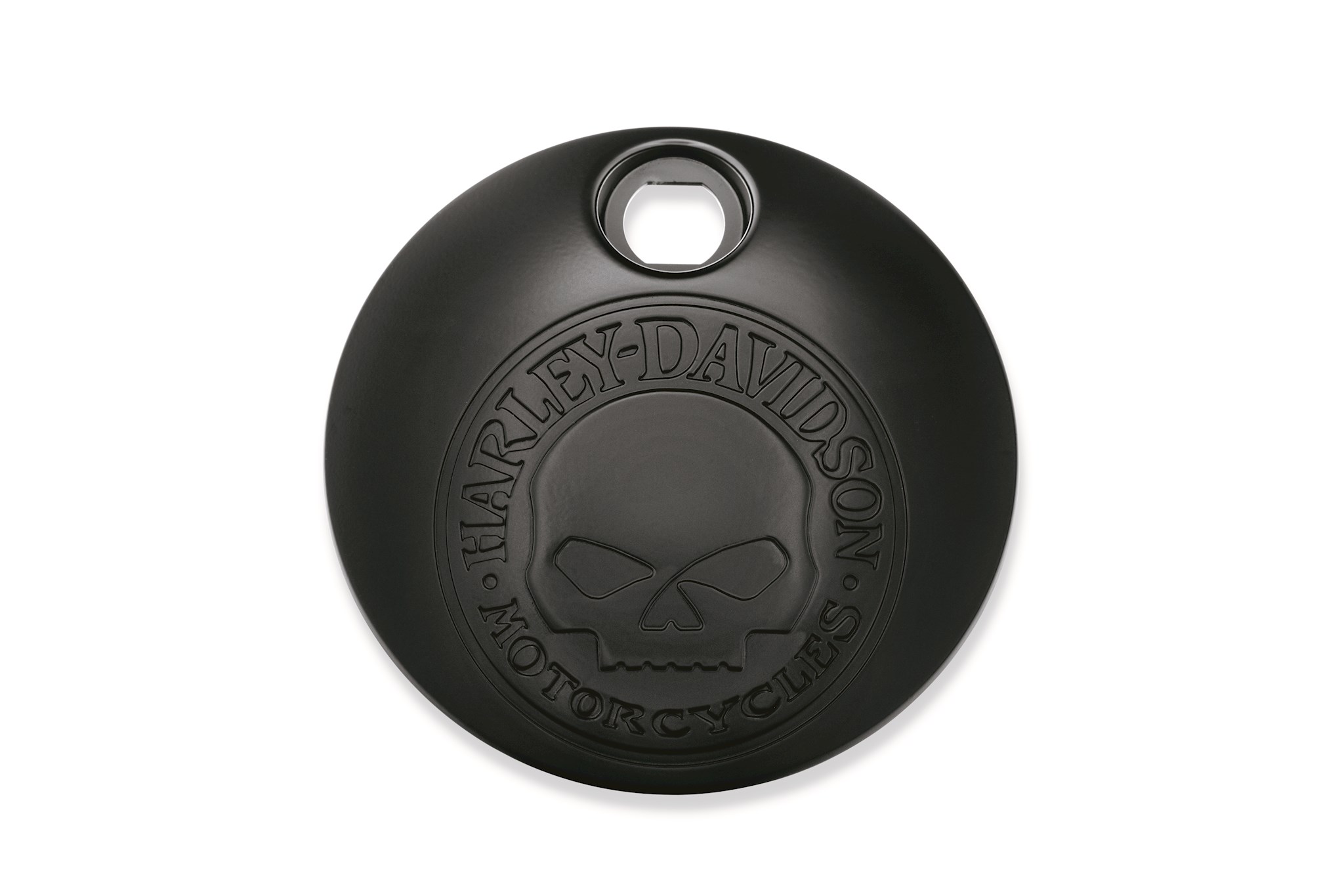 Penned at the hand of Willie G, the famous Skull Collection makes a shift to the dark side. Completely drenched in matte black, the raised skull and surrounding Harley-Davidson Motorcycle script adds a subtle ominous touch to your ride. The matte finish easily coexists alongside gloss black or wrinkle black surfaces. The complete collection of components includes matching black hardware.