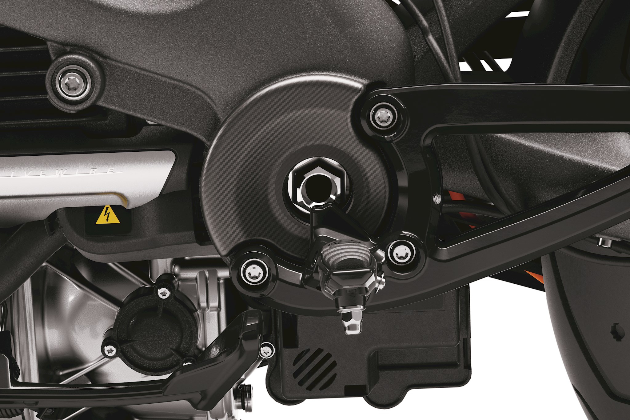 Styled in rich gloss black with chrome highlighted accents or matte-finished carbon fiber, these accent covers add a unique and finished look to your LiveWire model. Kit includes Large and Small Transmission Accent Covers and a Left Side Swingarm Pivot Bolt Cover.