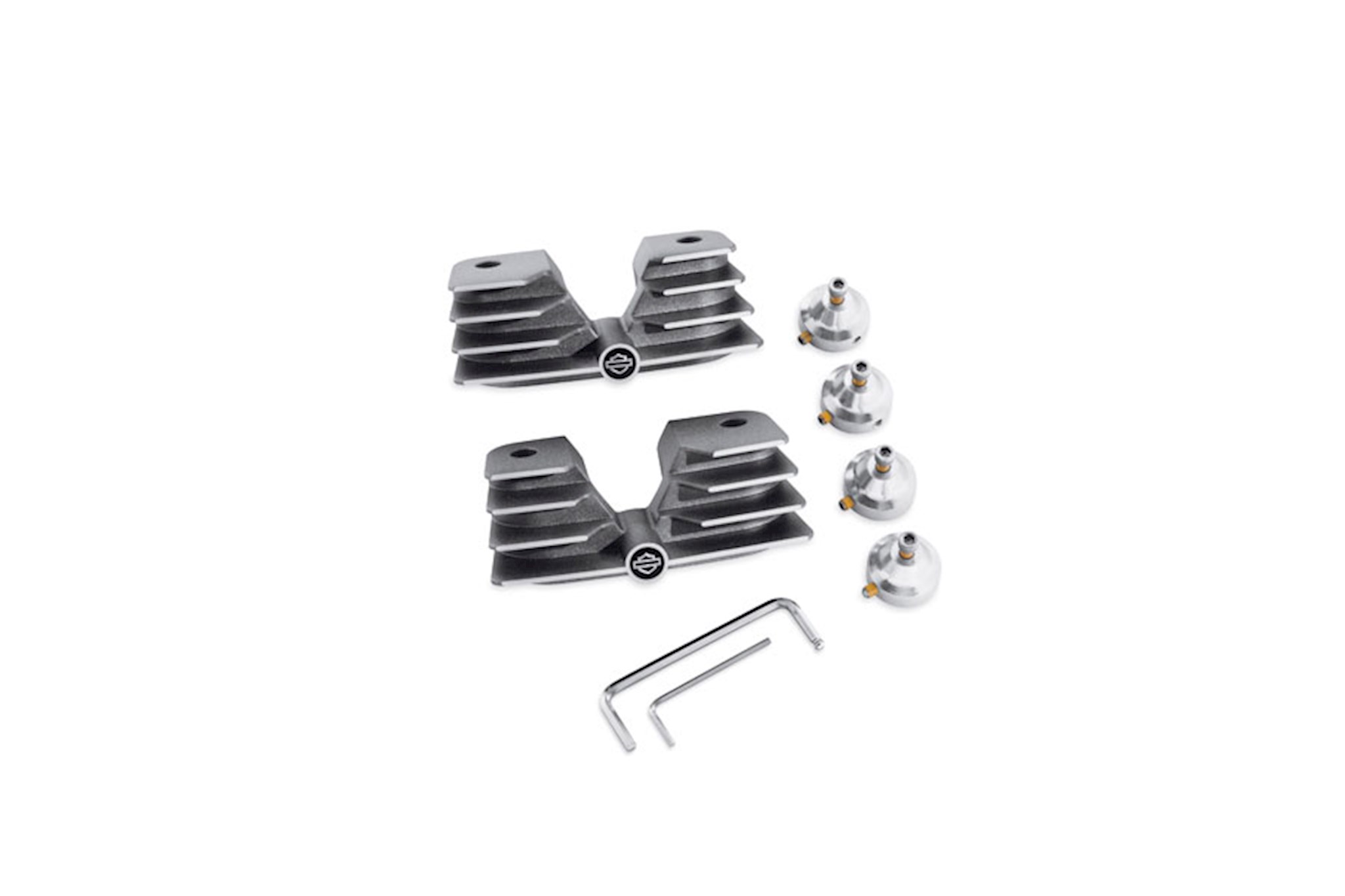 This exclusive aluminum Finned Headbolt Bridge covers both headbolts and the spark plug, filling out your cylinder fins all the way to the rocker box. Featuring an engraved Bar & Shield emblem, the bridge is easy to install with unique headbolt mounts. All necessary mounting hardware included. Sold in pairs.