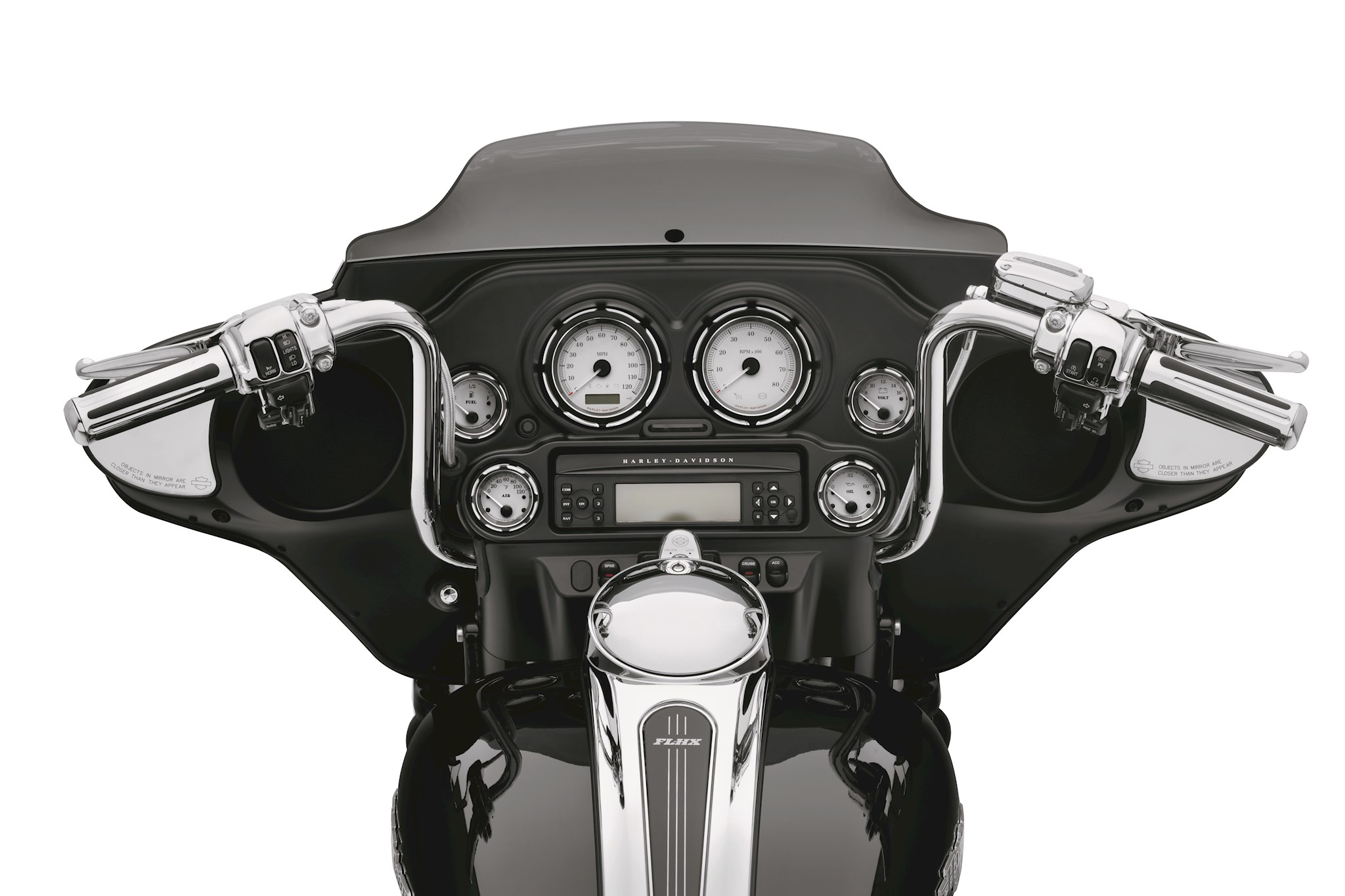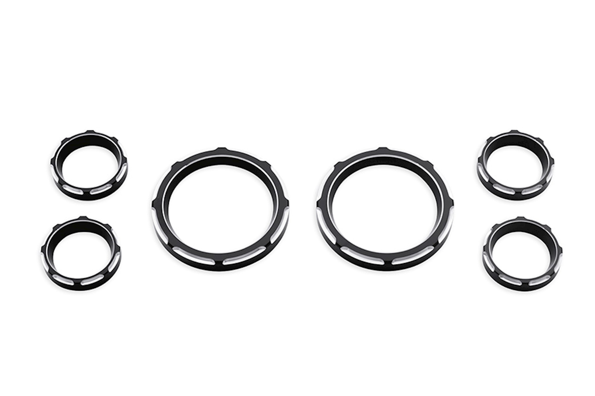 Complete the custom look of the inner fairing. Burst Collection Gauge Bezels feature contrasting gloss black and sculpted machined surfaces that send reflections of light in all directions. The perfect match for Burst Speaker Trim, this easy to install gauge bezel kit includes two 4.0" Speedometer and Tachometer bezels and four 2.0" auxiliary gauge bezels.