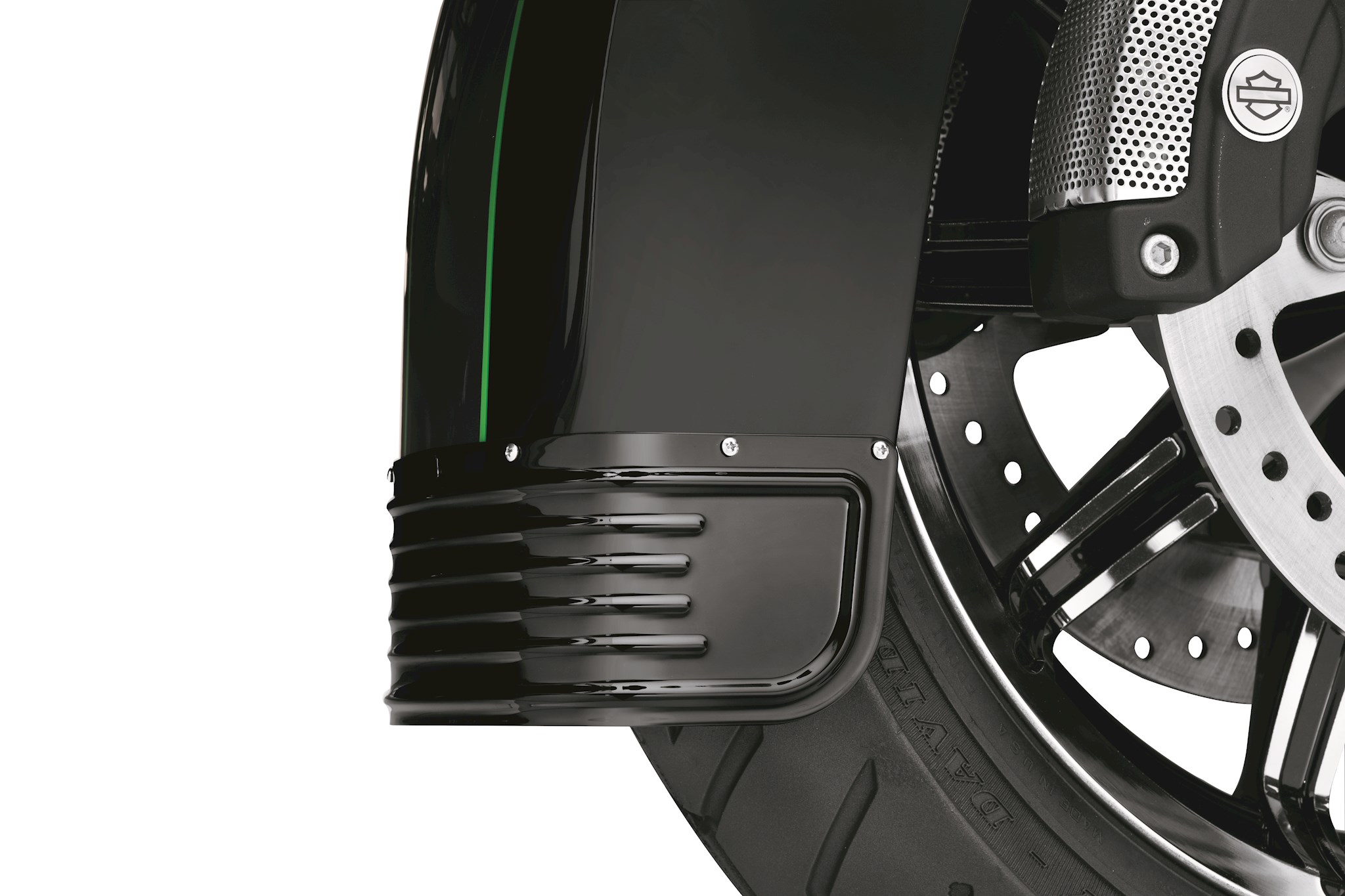 Designed as an easy-to-install replacement for the Original Equipment fender trim, this formed steel fender skirt features four raised accent ribs that wrap around the rear to add depth and texture. Available in your choice of mirror-finished chrome or gloss black finishes, the skirt is the perfect complement to any styling direction. And for a distinctive look, the flat side panels are the perfect spot to place your choice of self-adhesive medallions (sold separately). Kit includes mounting hardware. Fits '14-later Touring and Tri Glide® models with Original Equipment fender skirts.