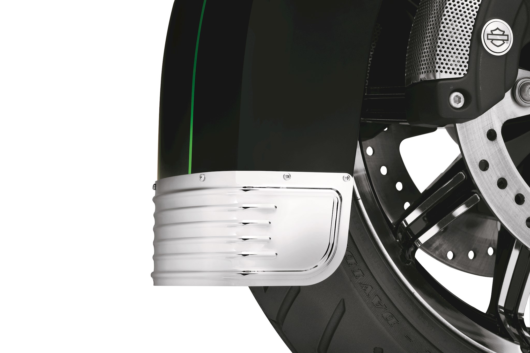 Designed as an easy-to-install replacement for the Original Equipment fender trim, this formed steel fender skirt features four raised accent ribs that wrap around the rear to add depth and texture. Available in your choice of mirror-finished chrome or gloss black finishes, the skirt is the perfect complement to any styling direction. And for a distinctive look, the flat side panels are the perfect spot to place your choice of self-adhesive medallions (sold separately). Kit includes mounting hardware. Fits '14-later Touring and Tri Glide® models with Original Equipment fender skirts.