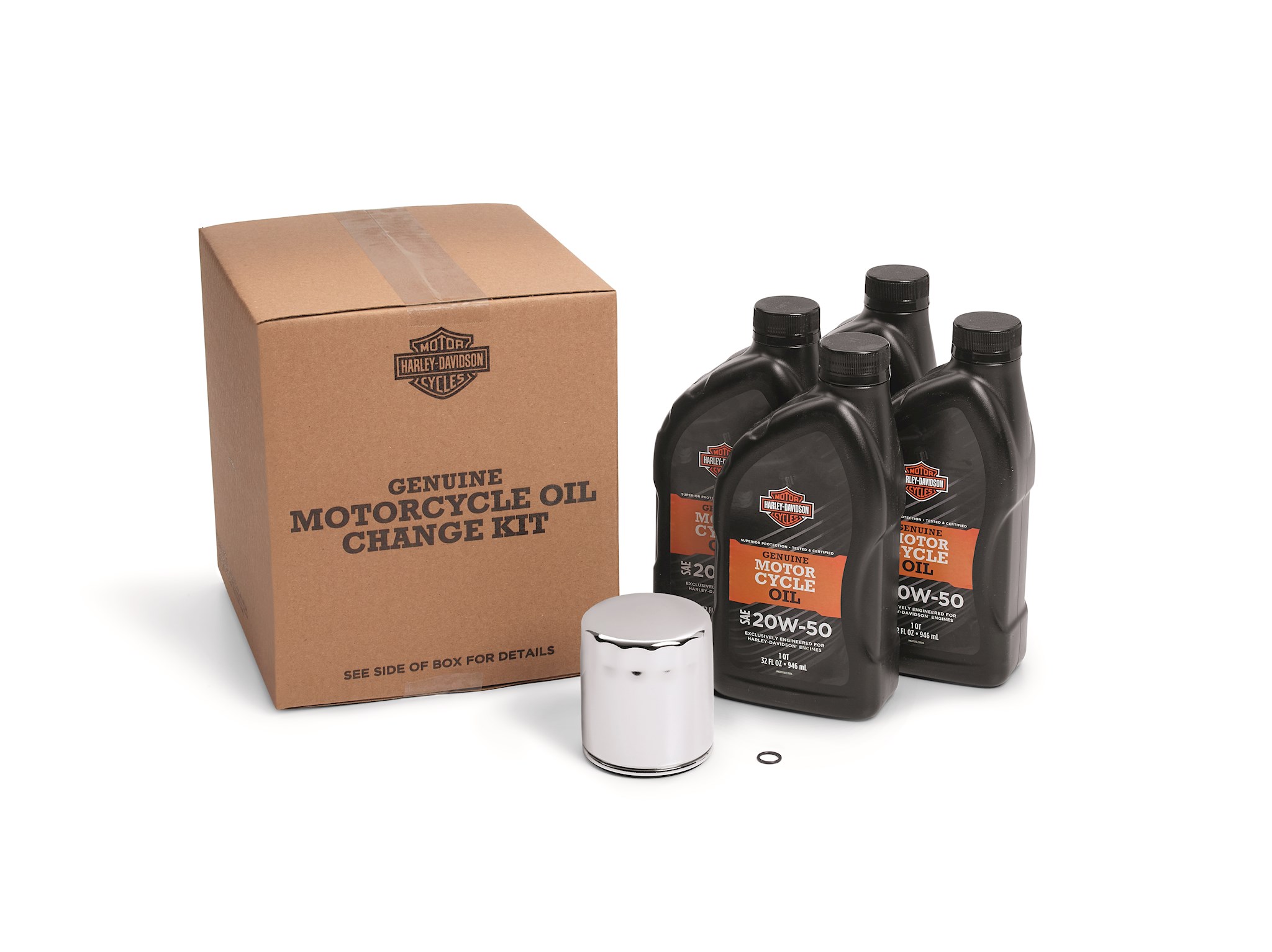 Everything you need for a complete engine oil and filter change. Select Harley-Davidson approved Screamin’ Eagle® SYN3® Synthetic Lubricant or genuine H-D® 360 Motorcycle Oil, and choose a black or chrome SuperPremium5-micron Oil Filter. Package includes Oil, Superpremium5 Oil Filter, and replacement O-Ring.