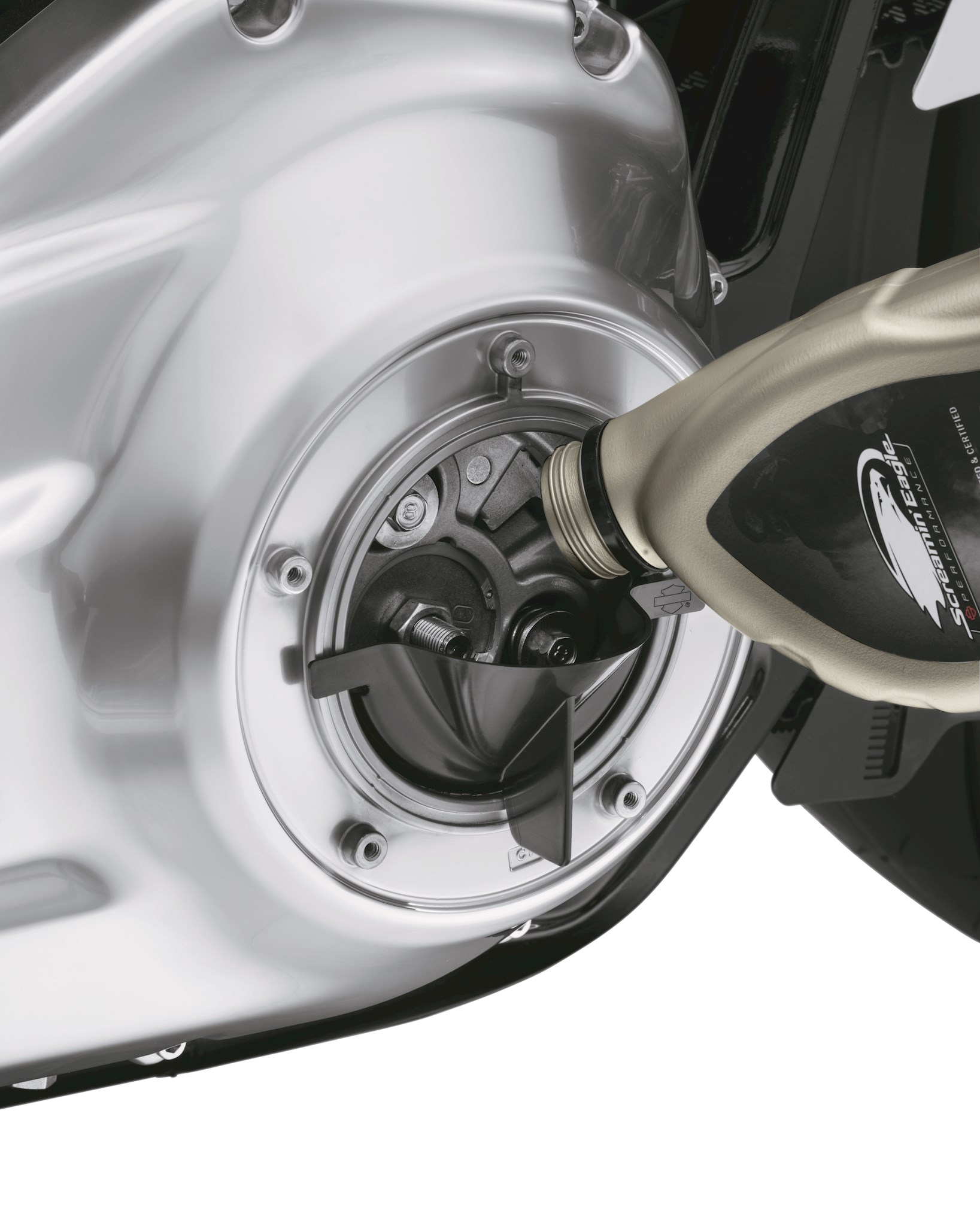 This reusable funnel makes it easy to add oil to your primary cavity. The funnel simply snaps into the derby cover opening to permit hands-free filling on the specified models. The convenient tab allows you to place the funnel in position with one hand, and the flat cone shape makes it easy to fill a tight area with no mess or spills. Smooth orange plastic surface is easy to clean after use.