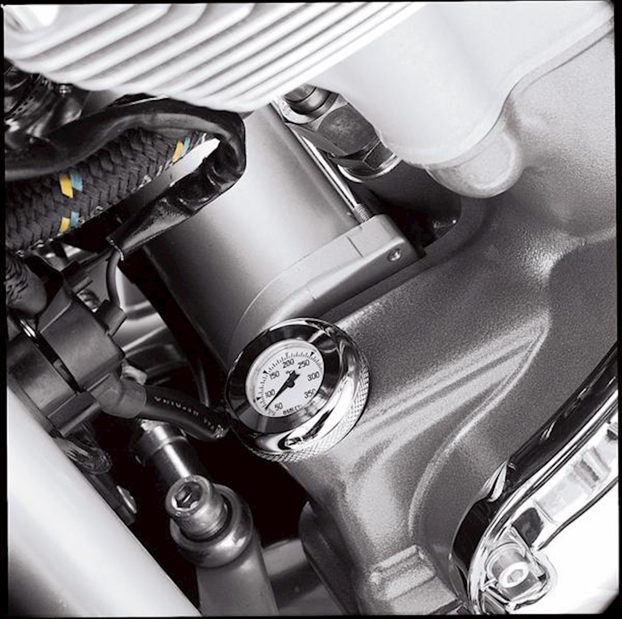 Replace your Original Equipment oil dipstick with this custom-styled version featuring an easy-to-see mechanical temperature readout with "Harley-Davidson" logo. A knurled, chrome-plated aluminum cap completes the styling and provides an easy grip for removal.