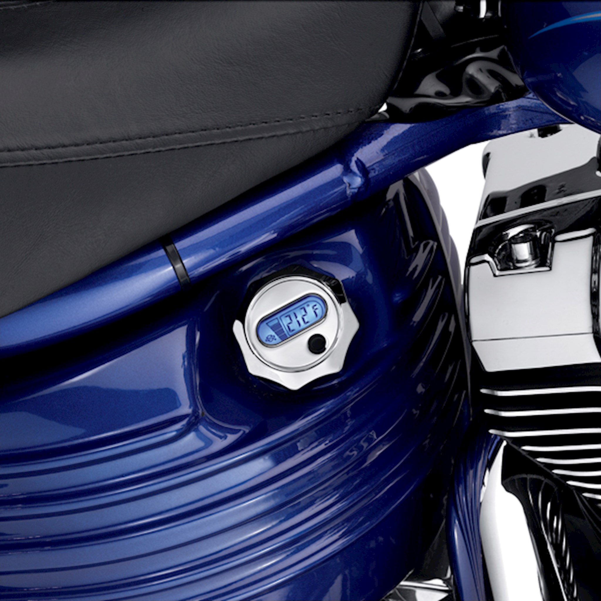 No more grabbing a rag to pull your hot dipstick. No more oil drips on your pipes and on the garage floor. These stylish yet hard-working dipsticks allow you to check your oil level and oil temperature with the push of a button. Simply push the button and this dipstick lights up with a brilliant backlight. Oil level is indicated by a four-segment readout — it even reminds you to check your oil when it is hot. Capacitive level sensing technology provides the highest degree of accuracy and durability. The waterproof LCD readout operates on a long-lasting, replaceable lithium coin-type battery (CR2032 3V, P/N 66000107). Display features a low battery indicator, and press-and-hold feature to toggle between Fahrenheit and Celsius. Fits '08-later FXCW, FXCWC, FXSB, FXSBSE and FXSTSSE3 models.
