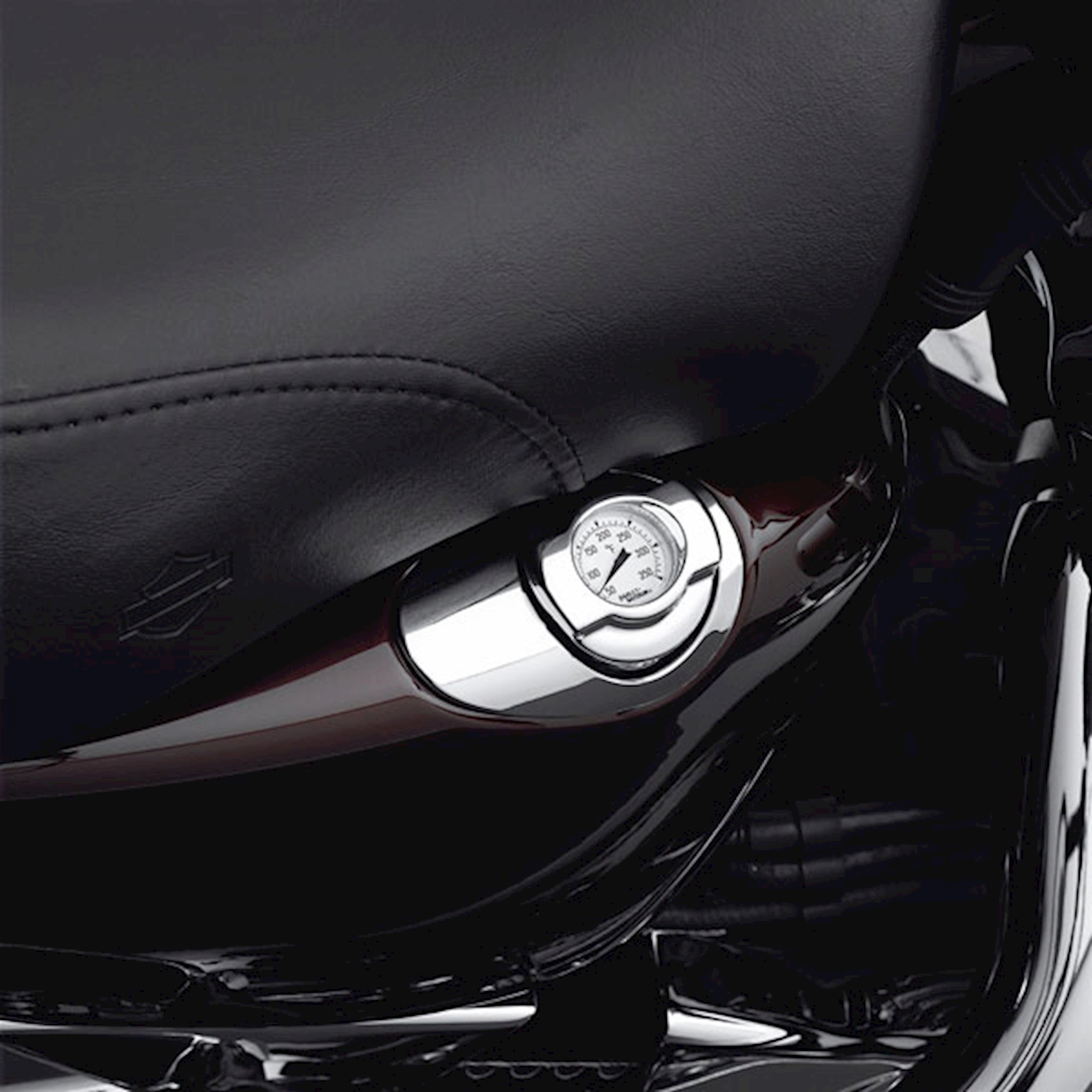 Replace your Original Equipment oil dipstick with this custom-styled version featuring an easy-to-see mechanical temperature readout with "Harley-Davidson" logo. A chrome-plated cap completes the styling and provides an easy grip for removal.