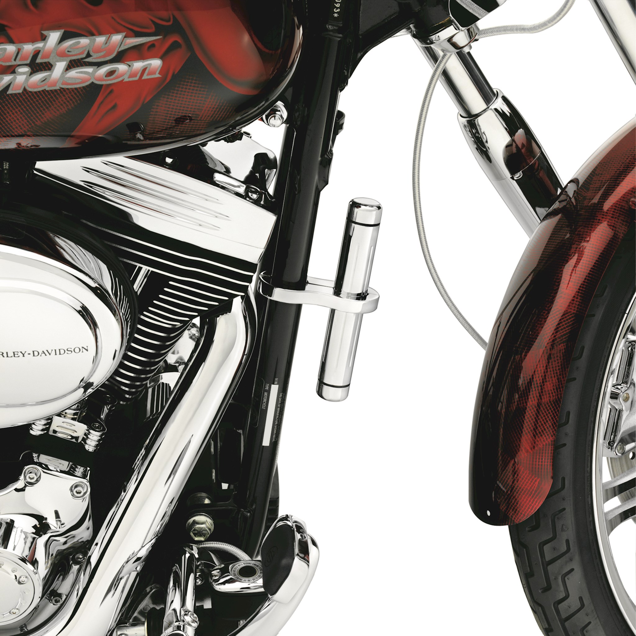 Machined from 6061 billet aluminum, this finely detailed Billet Storage Tube offers a convenient storage location for essential tools, sunglasses (2.0" versions) or registration papers. The mirror-chrome "ball-milled" tube features water-resistant threaded and O-ring sealed end caps on both ends for convenient access. The billet mounting clamp is adjustable for position and allows interference-free installation on the front down tube of the specified models. Available in three sizes for every storage need. Includes all necessary mounting hardware. Fits '00-'03 XL, '00-'05 Dyna and '00-later Softail models (except models with ABS brakes). Fits FLS, FXSB and FXSBSE models with ABS.