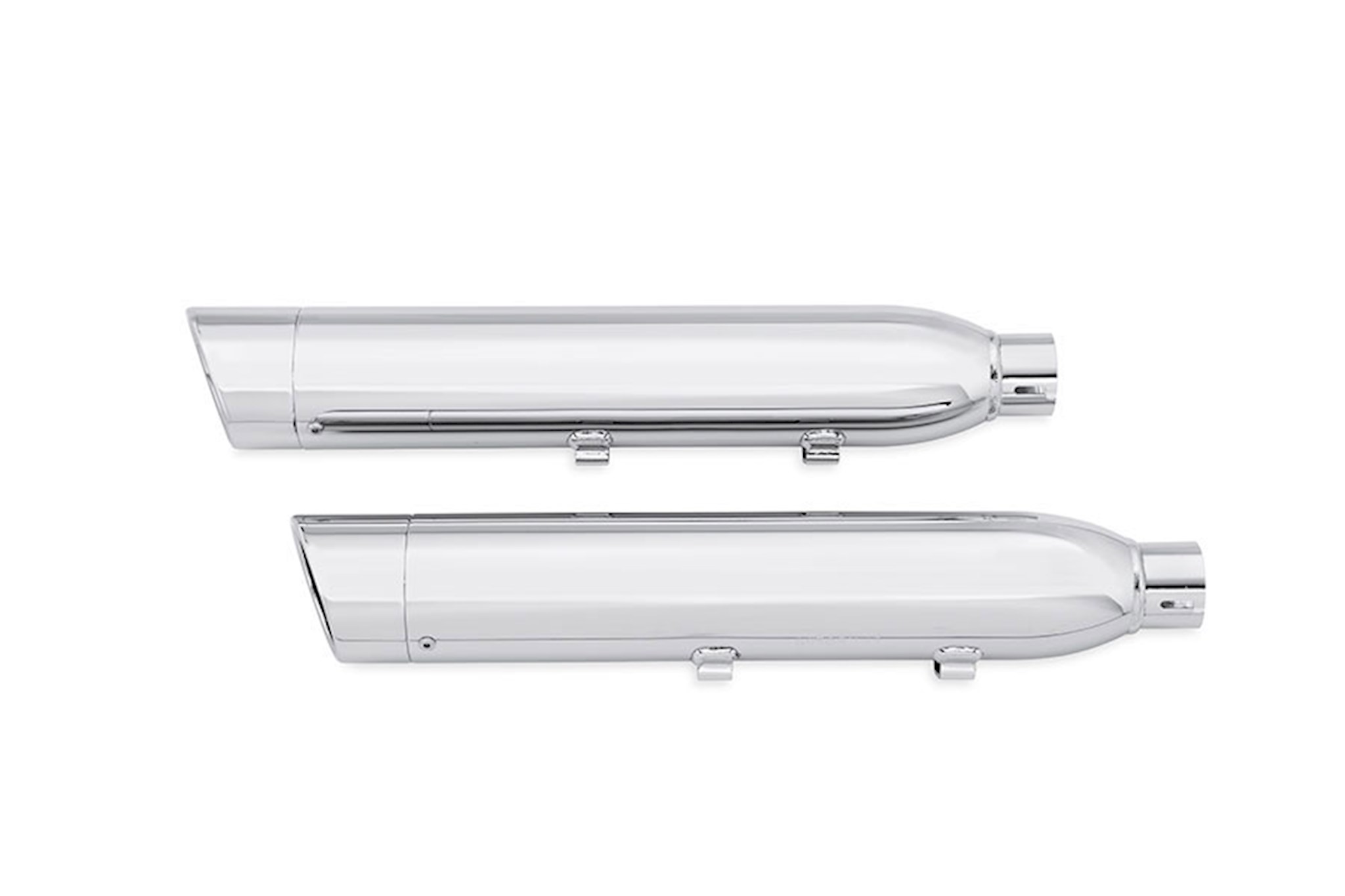 These 3.25" street compliant high-flow mufflers have been specifically tuned to deliver an aggressive exhaust note and improved performance while preserving the peace with your neighbors. Available in your choice of rich chrome or heat resistant jet black ceramic finish. Complete the look with your choice of 3.25" endcaps and Screamin' Eagle Muffler shields (sold separately). Fits '17-later XL1200 models. Designed for International markets that require ECE certified mufflers. Mufflers include matching slash down end caps. Installation requires separate purchase of Muffler Clamps P/N 65296-95A (Qty 2).