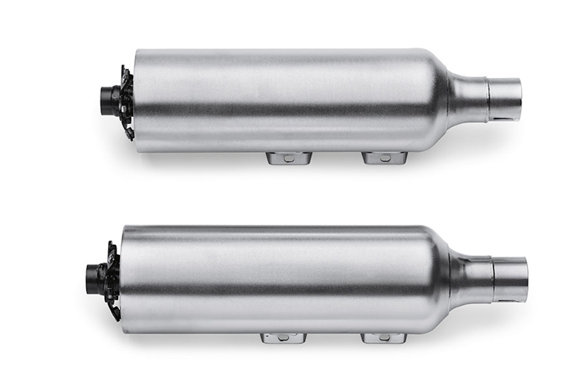 These 4.5" street compliant high-flow mufflers have been specifically tuned to deliver an aggressive exhaust note and improved performance. The straight-through perforated baffle reduces airflow restriction, and produces a rich exhaust note throughout the entire RPM range. You get a great performance, a powerful base rumble and a throaty tone while on the throttle, while maintaining a mellow note while cruising. Available in your choice of Brushed Satin Chrome or heat resistant Satin Black ceramic finish. Matching or contrasting end caps (sold separately) complete the custom look. Designed for International markets that require ECE certified mufflers. Fits '18-later FXFB and FXFBS models. Installation requires separate purchase of Muffler End Caps P/N 65100122 or 65100123.