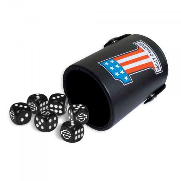 H-D® Dice Cup comes with a logo'd #1 Dice Cup and 6 black dice. > Leatherette Dice Cup. > Black Felt Lining. > 6 (18mm) Dice. > Dice Storage.
