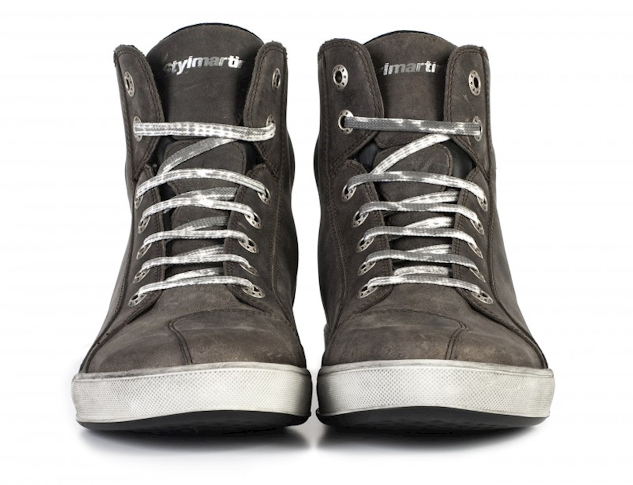 Deze motorschoen combineert een hip sneakerdesign met praktische eigenschappen voor gebruik op en naast de motor. De buitenlaag bestaat uit een volnerf waterafstotend leer. Deze zullen niet misstaan onder een jeans! Belangrijkste kenmerken: Retro look volnerf leer. CE-EN 1 gecertificeerd. Waterproof en ademende voering. Protectie: extra versteviging ter hoogte van het schakelpedaal, enkelprotectie (pu) aan beide zijden. Bevestiging: veters. Reflecterende zilver strip aan de achterzijde. Voetbed: anatomisch, uitneembaar en ademend. Zool: rubberen antislip zool, mix van zwart en grijs.