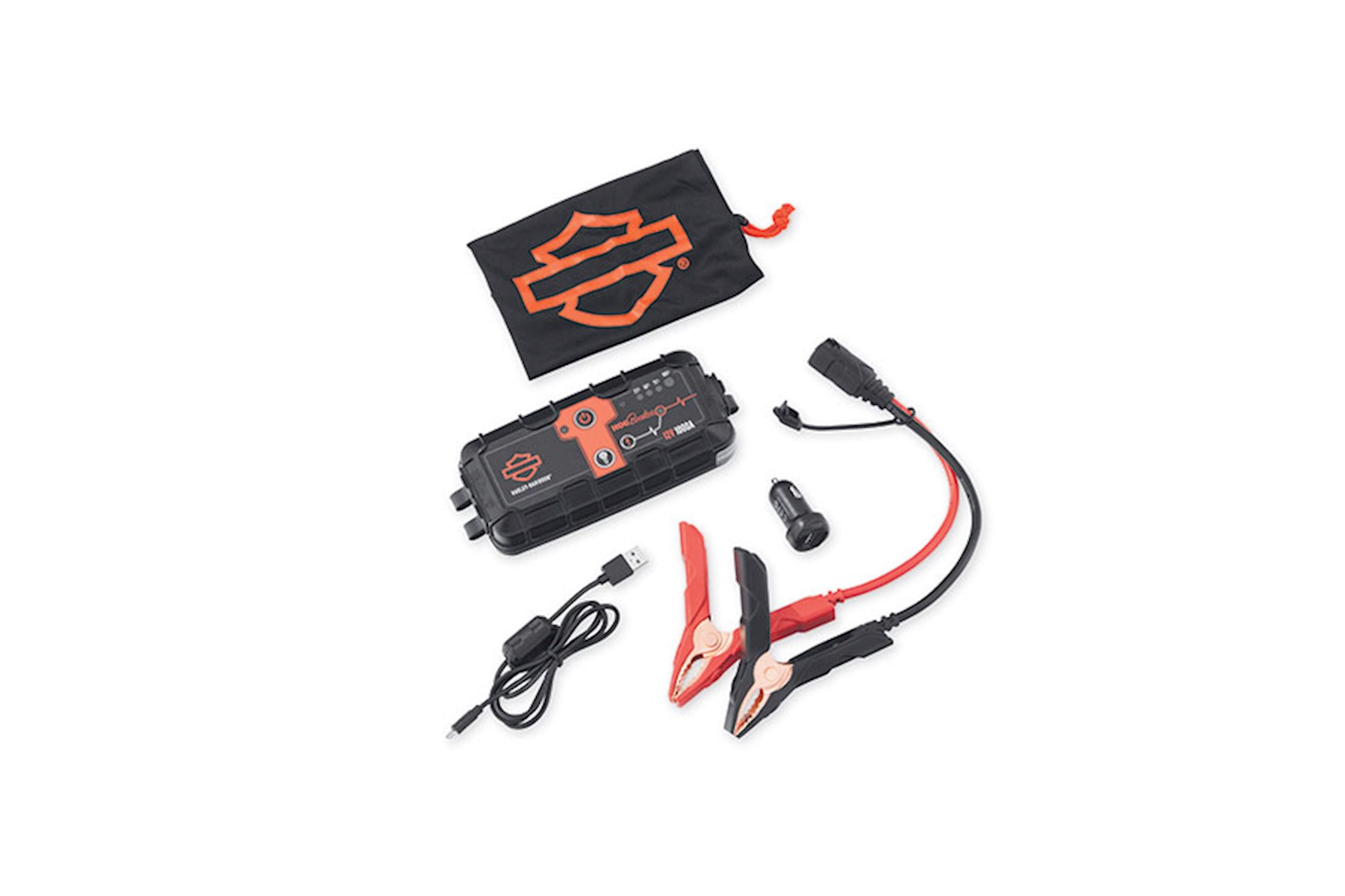 Think of it as a kick start for your weak battery. This lightweight, compact lithium powered battery pack is ready and waiting to jolt your battery back to life. Small enoughto fit in your saddlebag or backpack, this 1000 Amp portable battery pack will restart your motorcycle in seconds. The HOG® Booster easily connects to your motorcycle battery with high-quality alligator clamps, and the spark proof and reverse polarity protected connections help protect your bike’s electrical system. The HOG Booster’s internal lithium battery can be recharged anywhere – from a wall outlet using your cell phone charging block, from your computer’s USB port, or from a 12V power outlet (with the included adapter). A fully charged HOG Booster will provide up to 20 starts on a single charge and, can also power and charge USB devices like cell phones and cameras to keep you in touch while on the road. The HOG Booster also features a built-in 100 lumen flashlight with high, low and strobing SOS modes so you have a light source when you need it. Complete kit includes HOG Booster unit, high quality alligator clips and cables, 12V/cigarette Lighter adaptor, handy storage bag, and east to read instruction manual. Technical Data: Internal Battery – Lithium Ion Peak current Rating– 1000A Joules – 7000J Micro USB (Input) – 5V, 2.1A USB (output) – 5V, 2.1A Weight – 2.4 lbs. Flashlight Lumens – 100 USB Charger Rating – .5A - 12 hrs; 1A - 6 hrs; 2A - 3 hrs.