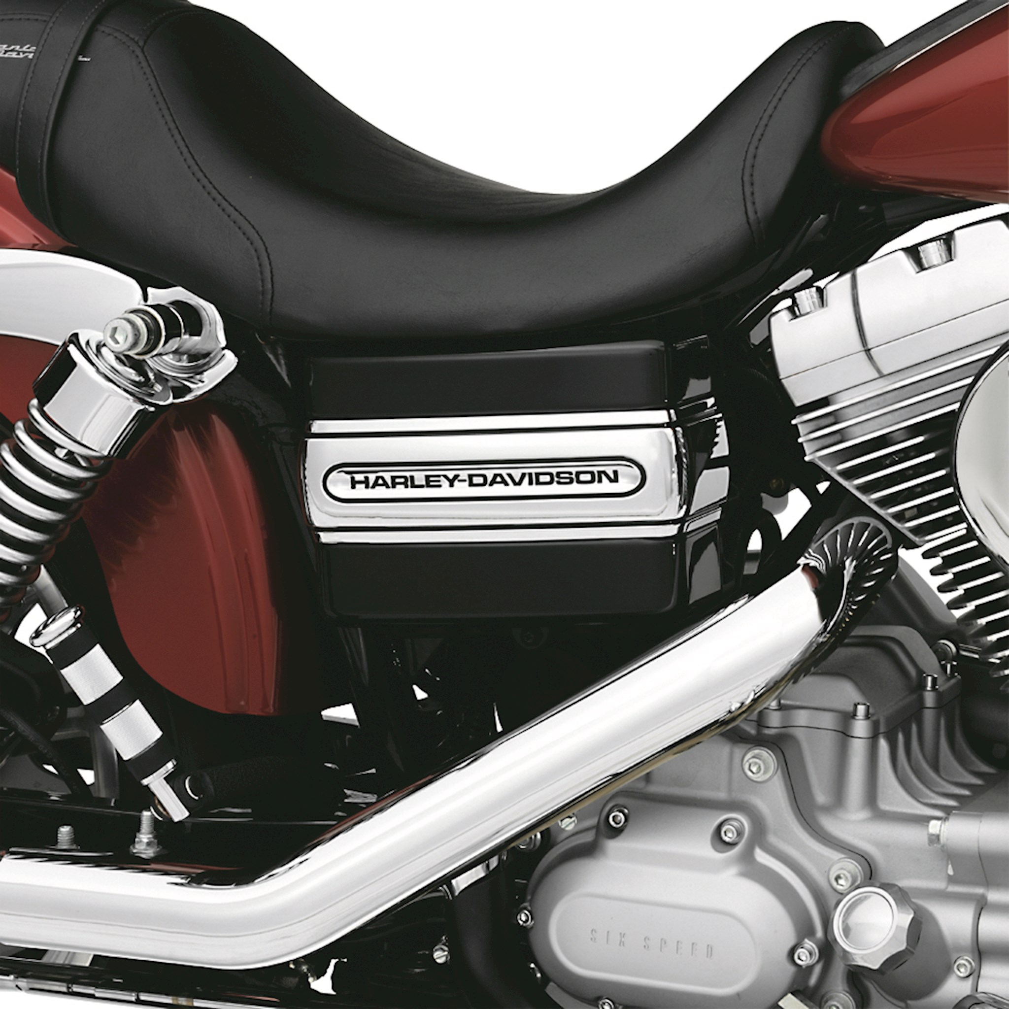 Replace the Original Equipment satin aluminum trim band with a splash of chrome. This easy-to-install custom contoured trim band features a black-filled embossed "Harley-Davidson" script design and offers a stunning contrast to the factory painted battery cover or a great finishing touch for the Chrome Battery Cover P/N 66375-06 or 61300186.