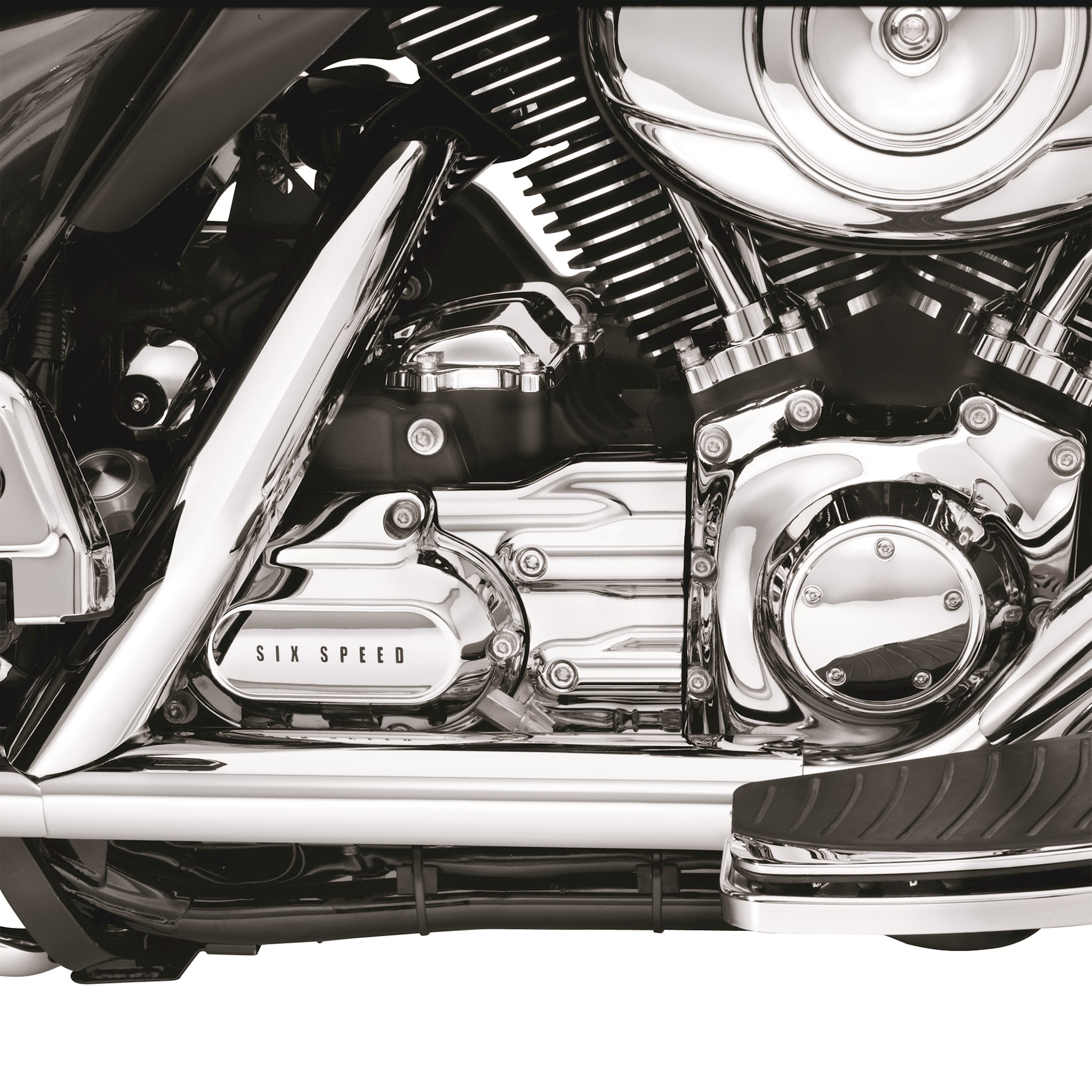Bridge the space between the cam cover and the transmission in style. The cast and chrome-plated cover conceals the space between the transmission and gearcase cover, bringing a unified look to the right side of your Touring bike. Kit includes all necessary mounting hardware.