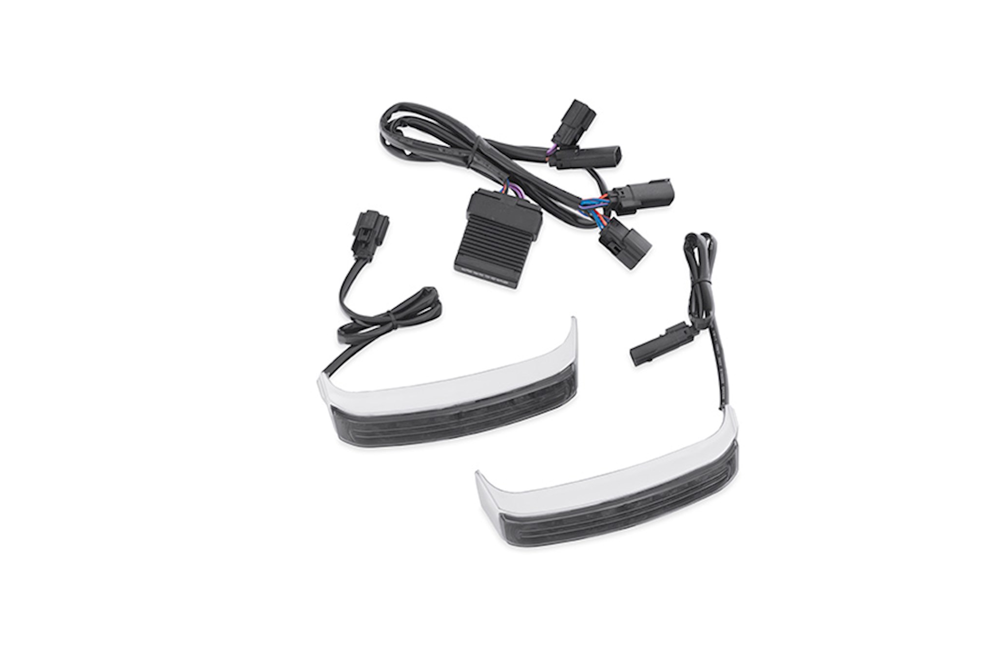 Add functional lighting to the rear of your Touring bike. These running, directional and brake lights command the attention of following vehicles. The bright, fast-acting LED lamps glow red when the ignition is on, and intensify when the turn signals or brakes are activated. The lamps act as a supplement to the Tour-Pak® luggage mounted rear lighting. The lamps are housed in a low-profile chrome frame that is contoured to hug the curve of the hard saddlebags. The self-adhesive lamps fit seamlessly beneath the saddlebag lid and add a stylish touch of color, even when the bike is parked. Complete kit includes left and right lamps, modulator and quick-disconnect wiring harness. Fits '14-later FLHTCU, FLHTCUL, FLHTK and FLHTKL models. Does not fit FLHTKSE.