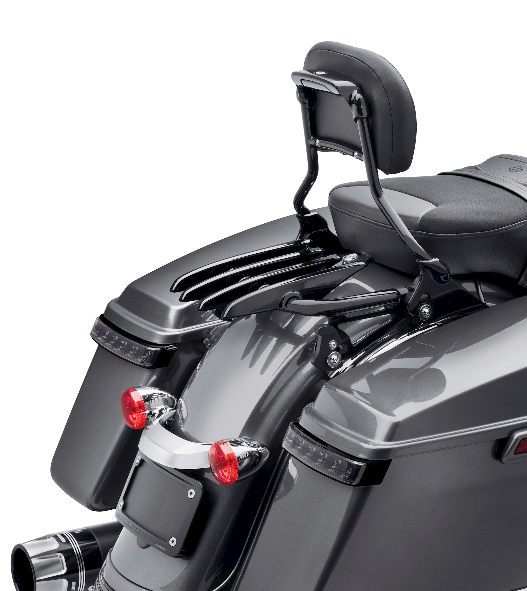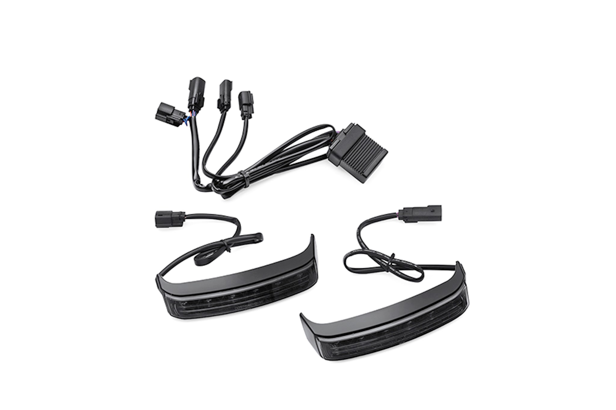 Add functional lighting to the rear of your Touring bike. These running, directional and brake lights command the attention of following vehicles. The bright, fast-acting LED lamps glow red when the ignition is on, and intensify when the turn signals or brakes are activated. The lamps act as a supplement to the Tour-Pak® luggage mounted rear lighting. The lamps are housed in a low-profile frame that is contoured to hug the curve of the hard saddlebags. The self-adhesive lamps fit seamlessly beneath the saddlebag lid and add a stylish touch of color, even when the bike is parked. Complete kit includes left and right lamps, modulator and quick-disconnect wiring harness. Fits '14-later FLHX, FLHXS, FLTRX and FLTRXS models. Does not fit Canadian models.