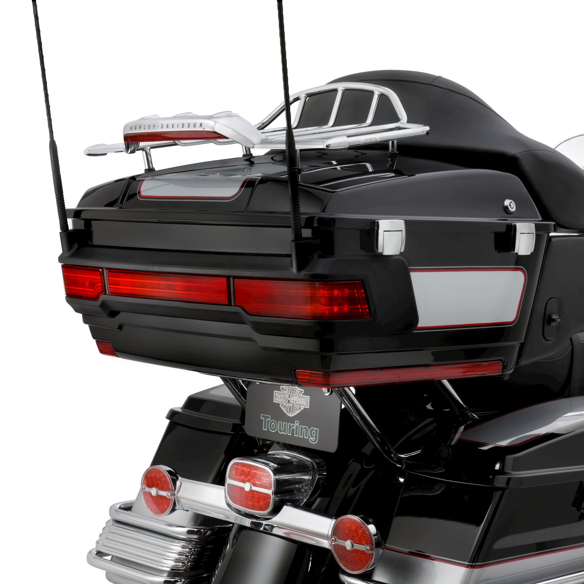 Add high-mount turn signals, running and brake lamps to your Classic and Ultra King Tour-Pak. This wrap-around light kit is equipped with bright, fast-acting LED lamps that grab the attention of following traffic. The corner lights operate in run/brake/turn mode and the center lamp functions as a run and brake lamp. The slim-line design mounts to the exterior surface of the Tour-Pak and can be used to replace the Original Equipment Ultra-style lamp. When equipped with Tour-Pak Liner P/N 53302-07 (sold separately), this kit elimnates the interior bulges and maximizes the carrying capacity inside. Available with smoked or red lens, the lamp features a flat black surround that complements any solid or two-tone paint color. Kit accommodates single and dual-antenna applications. No cutting or splicing is required for installation and kit includes a simple drilling template, interior mounting plates, mounting hardware and wiring harness. Fits '97-'13 Touring models (except CVO™) equipped with King Tour-Pak luggage.