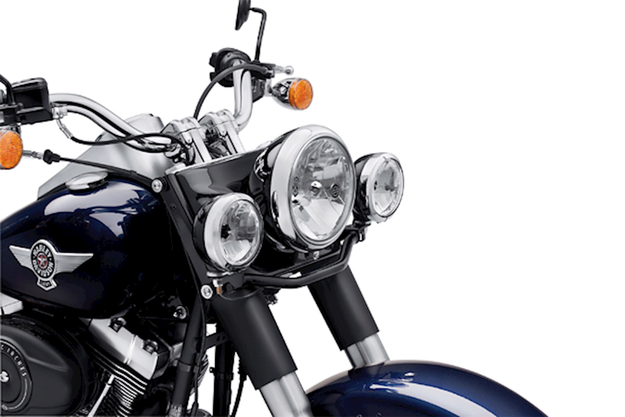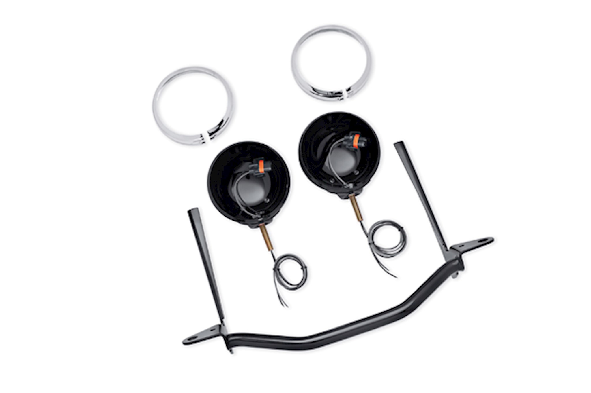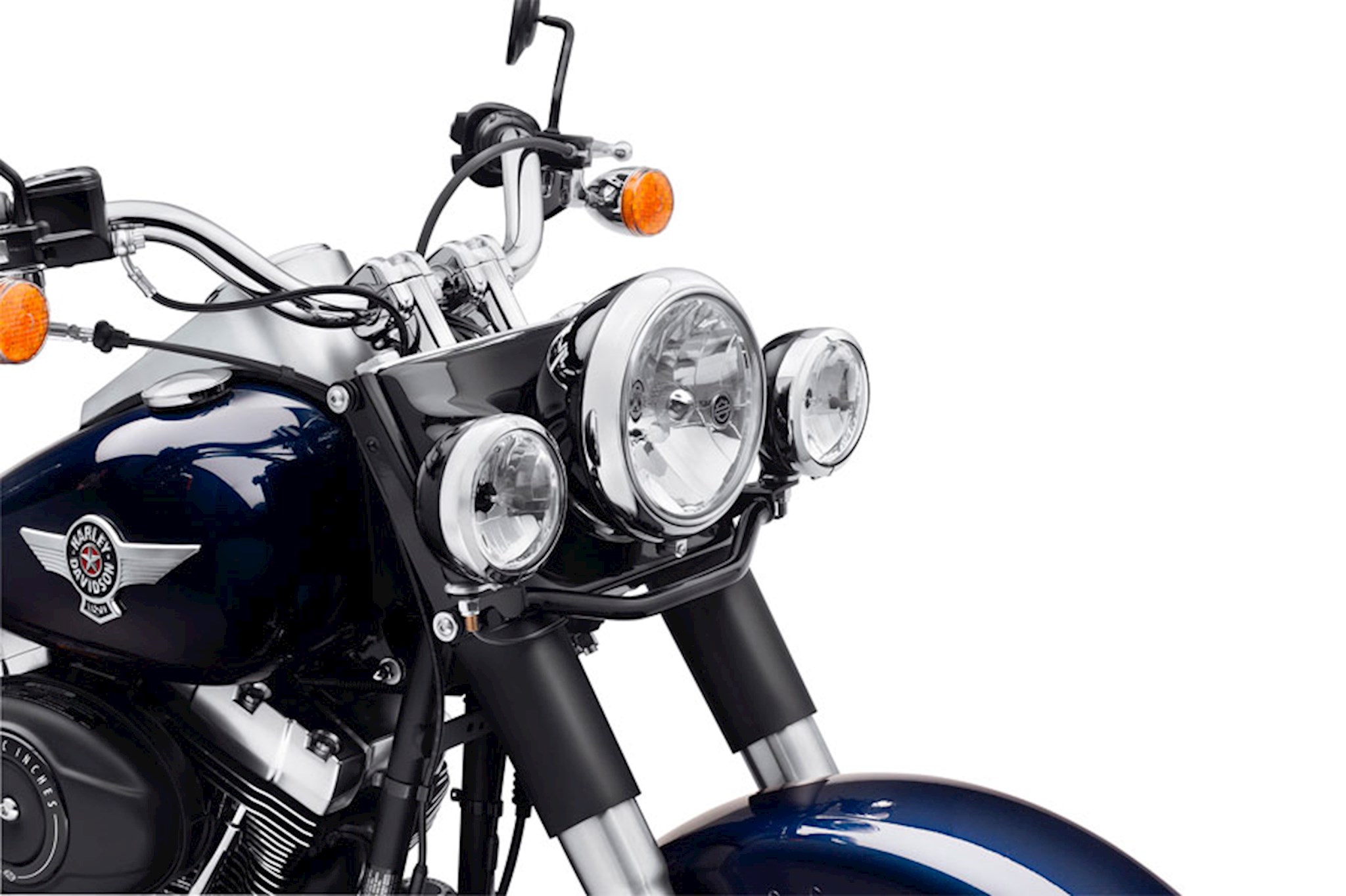 Function and style in one. This Auxiliary Lighting Kit features attractive mounting brackets and a tubular crossbar contoured to accent the headlamp. Available in bright chrome or gloss black finish, the kit includes lamp housings and all required wiring, toggle switch and hardware. All you need to add is your choice of bulb style and you'll light up the open road. (Bulbs sold separately.) Fits '00-later FLS, FLSTF, FLSTFB and '06 FLST models.