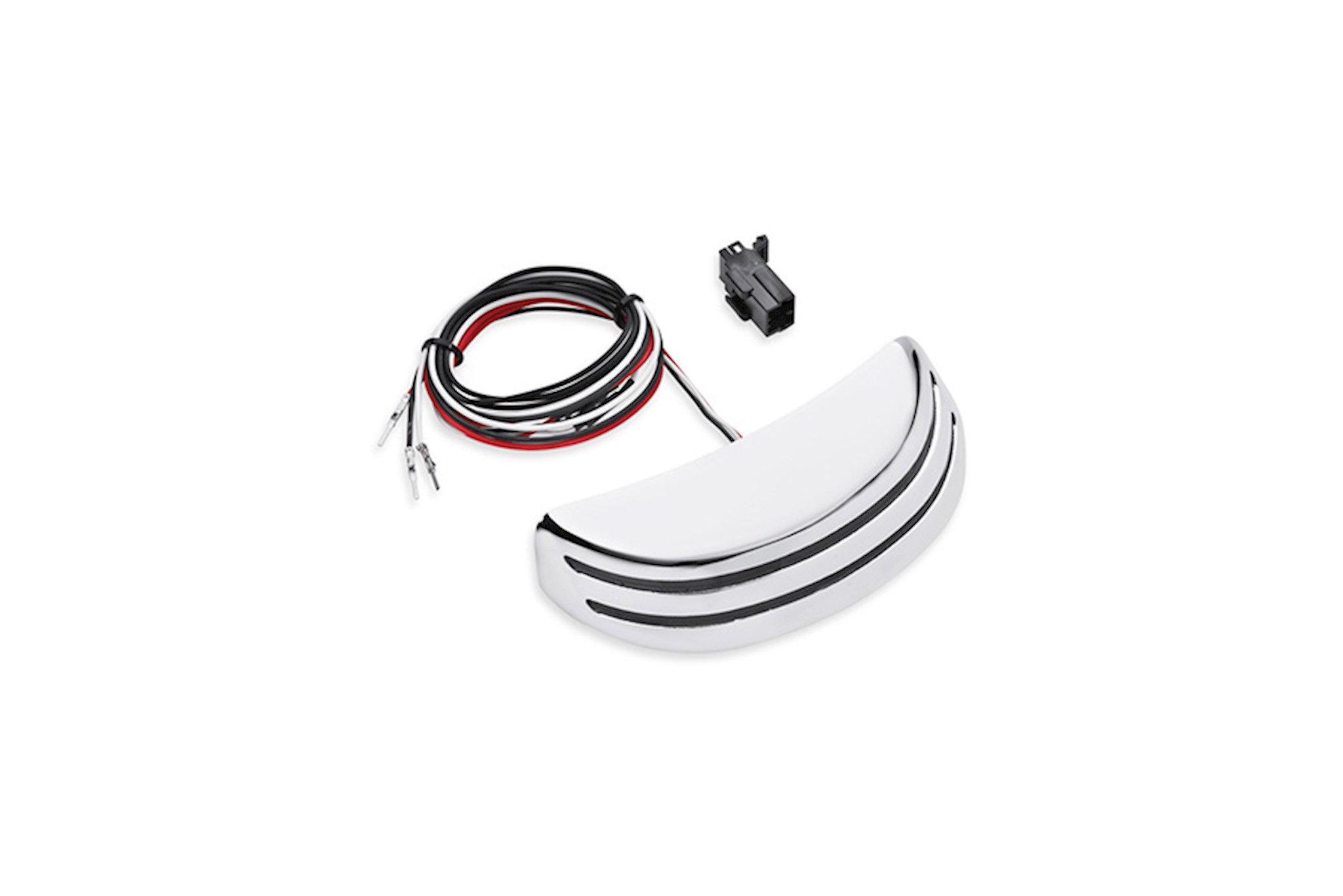 Brilliant red center-mount running and brake light grabs the attention of following vehicles. The fast-acting long life LEDs glow red when ignition is on and intensify when the brakes are applied. The low-profile chrome shell attaches to and hugs the contour of the turn signal bar for a custom look. Plug-in connection for easy installation.