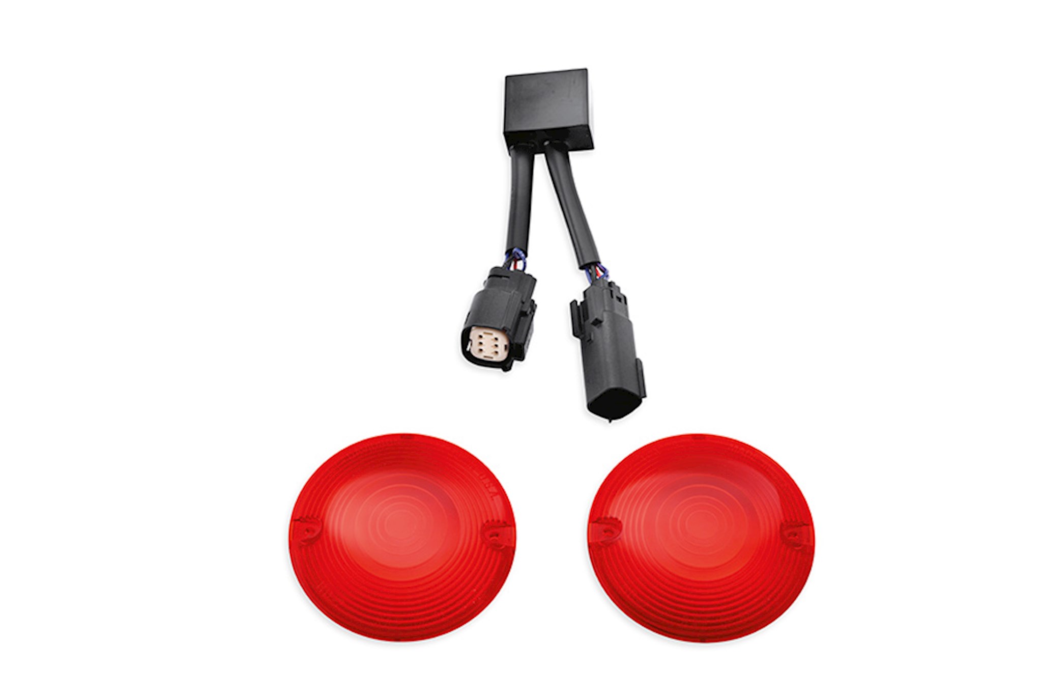 Turn signal module adds an auxiliary brake light and running light function to your existing turn signals for auxiliary rear lighting. Red lenses glow when the headlamp is on, and increase in intensity when brakes or turn signals are activated. Easy to install, the kit simply plugs into your existing wiring harness. Red turn signal lenses are included. Meets DOT requirements.