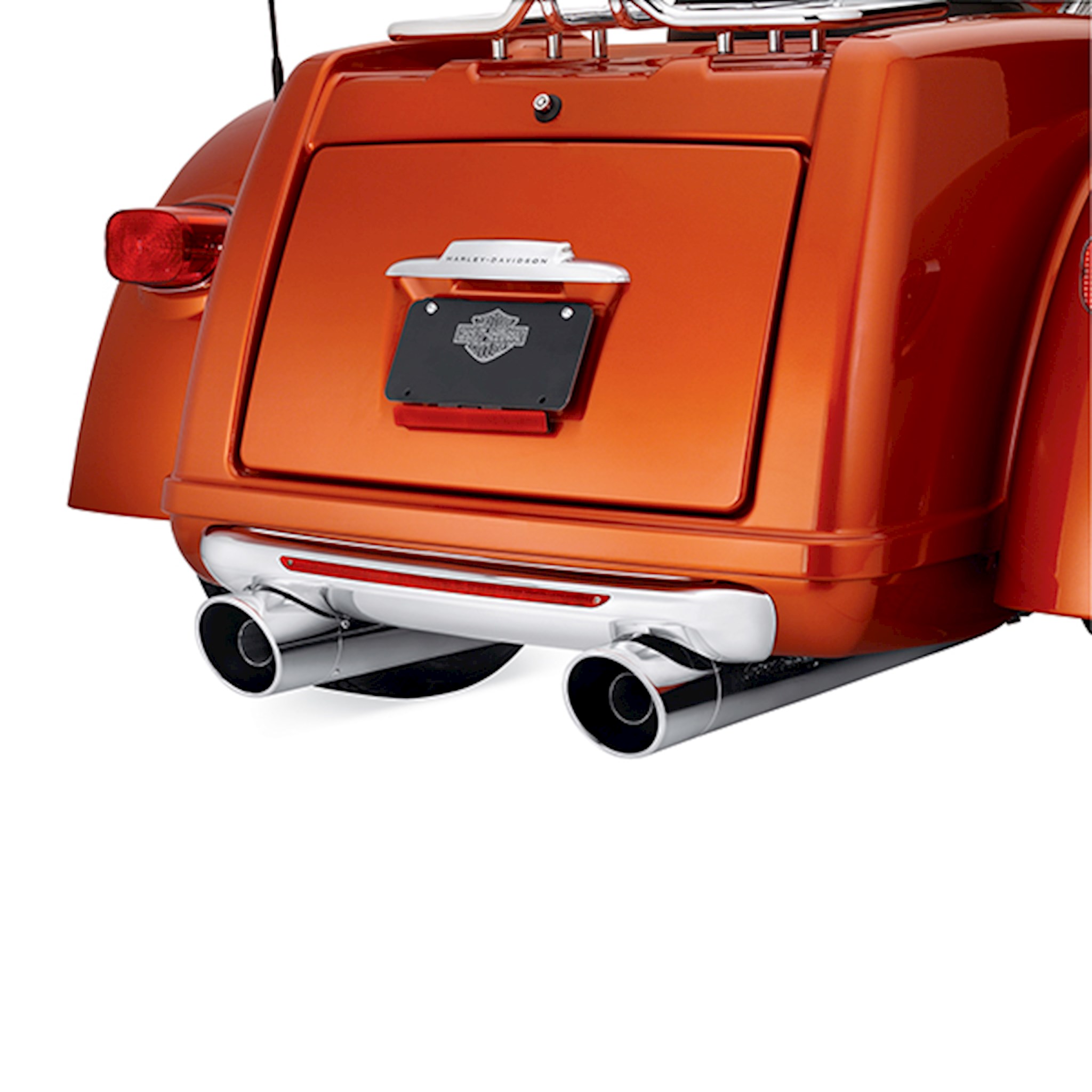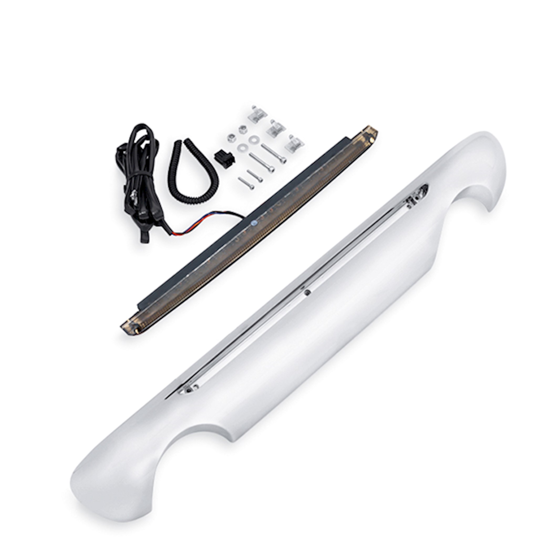 Sweeping chrome trim dresses the trunk fascia for a distinctive yet functional look. The inset LED light bar glows as a running lamp when the ignition is on and functions as an auxiliary red lamp when the brakes are applied. Available with smoked or red LED lens to match your customizing direction. Can be installed on models equipped with Trunk Guard. Fits '14-later Tri Glide® models. Will not fit with Exhaust Trim P/N 83843-09.