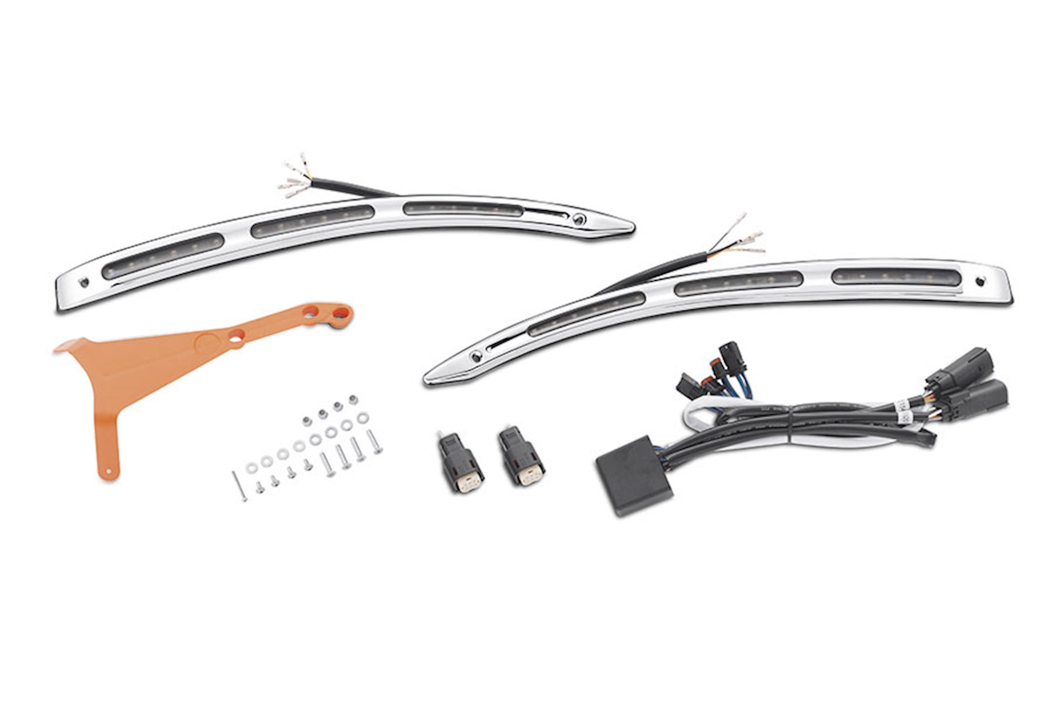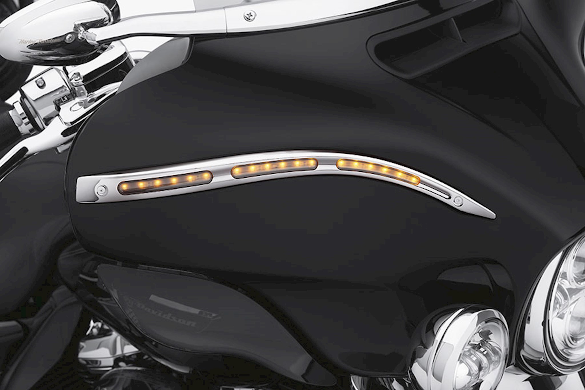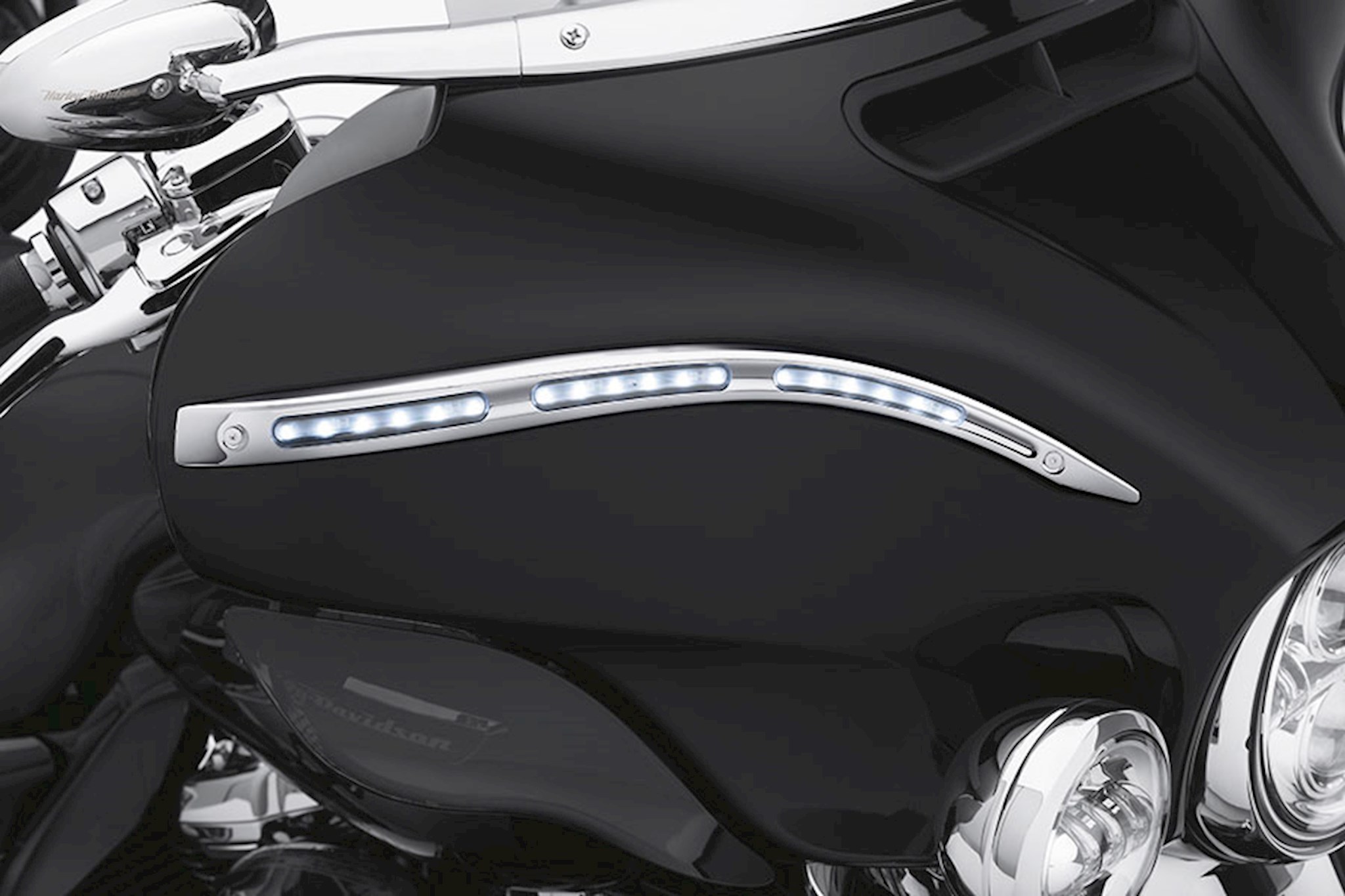 Sweeping trim dresses the Electra Glide® Batwing Fairing for a distinctive, yet functional look. The contour-hugging spear and smoked lenses hide LED lamps that glow white as running lamps when the ignition is on and function as auxiliary amber sequential directional indicators when the turn signals are activated. The wiring is concealed inside the fairing for a clean, custom appearance. Complete kit includes mounting template and all necessary installation hardware. Trim may cover pinstripes or two-tone paint lines on some vehicles. Check appearance prior to installation. Fits '14-later Electra Glide, Street Glide®, Ultra Limited, and Tri Glide® models.