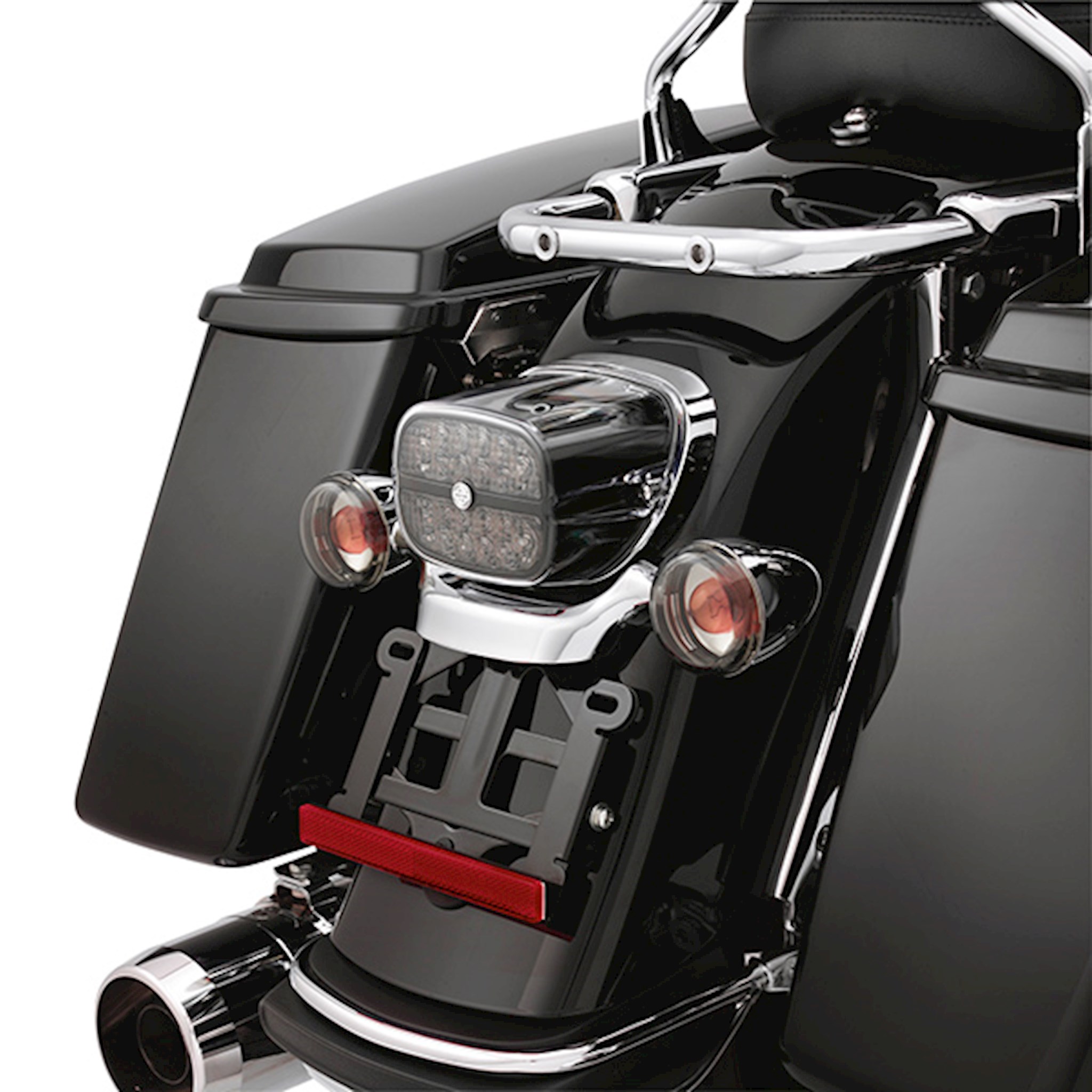 Combine LED technology and contemporary styling for a bright new look. Featuring a full array of 20 fast-acting red LED lamps, this brilliant running and brake lamp will grab everyone's attention. Designed to fit the contour of both Bobtail and full rear fenders, the smoked or red lens Bar & Shield logo-accented tail lamp complements any custom direction. The black or chrome bezel is wrapped in a clear outer housing for a mirror-like finish. Easy plug-in connection to the Original Equipment wiring harness. Fits '06-'09 FLHX, FLHTCSE2 and FLHRSE3/4, '09-later FLHR, FLHT and FLTR and models equipped with License Plate Relocation Kit P/N 53702-04.